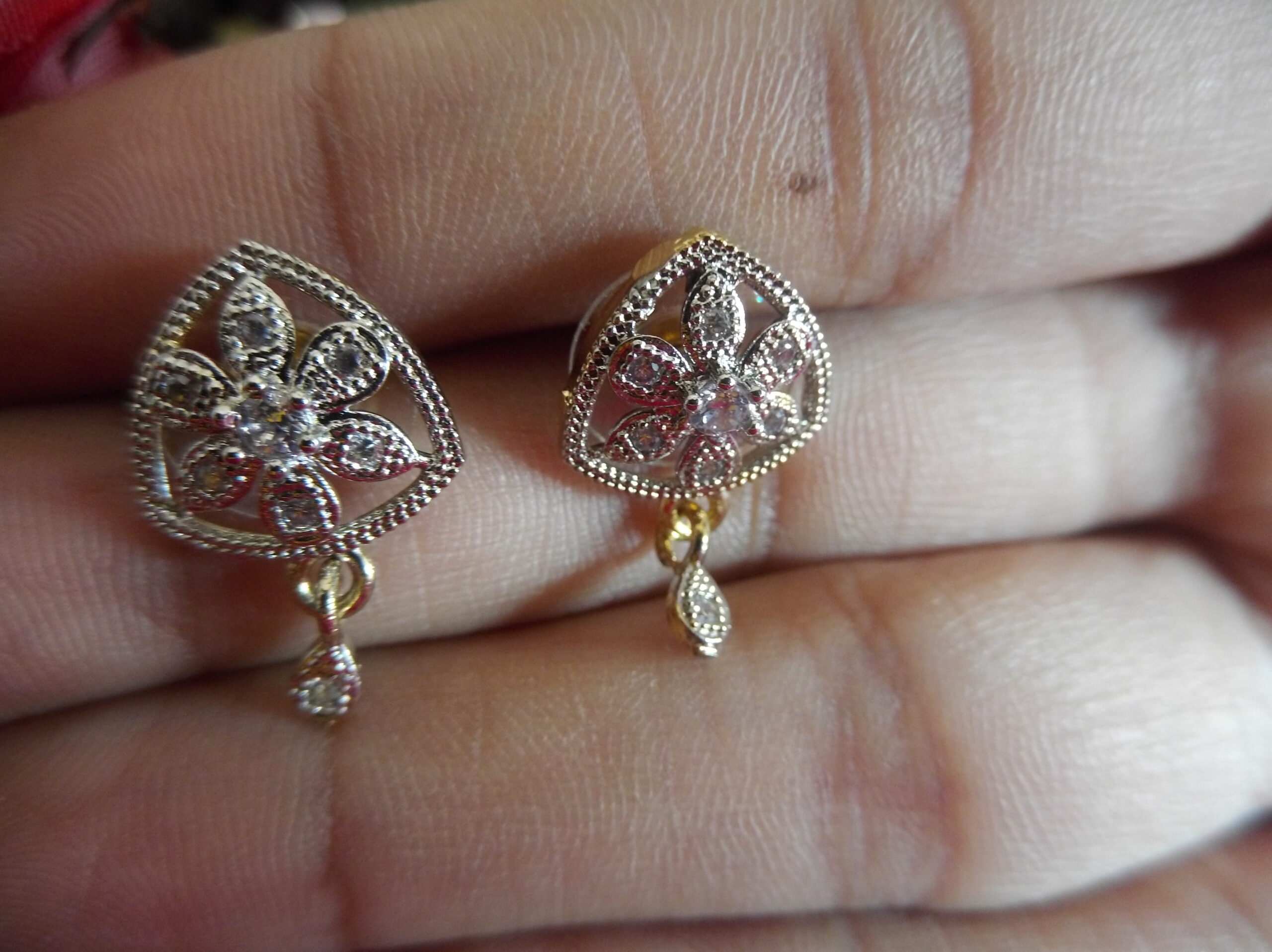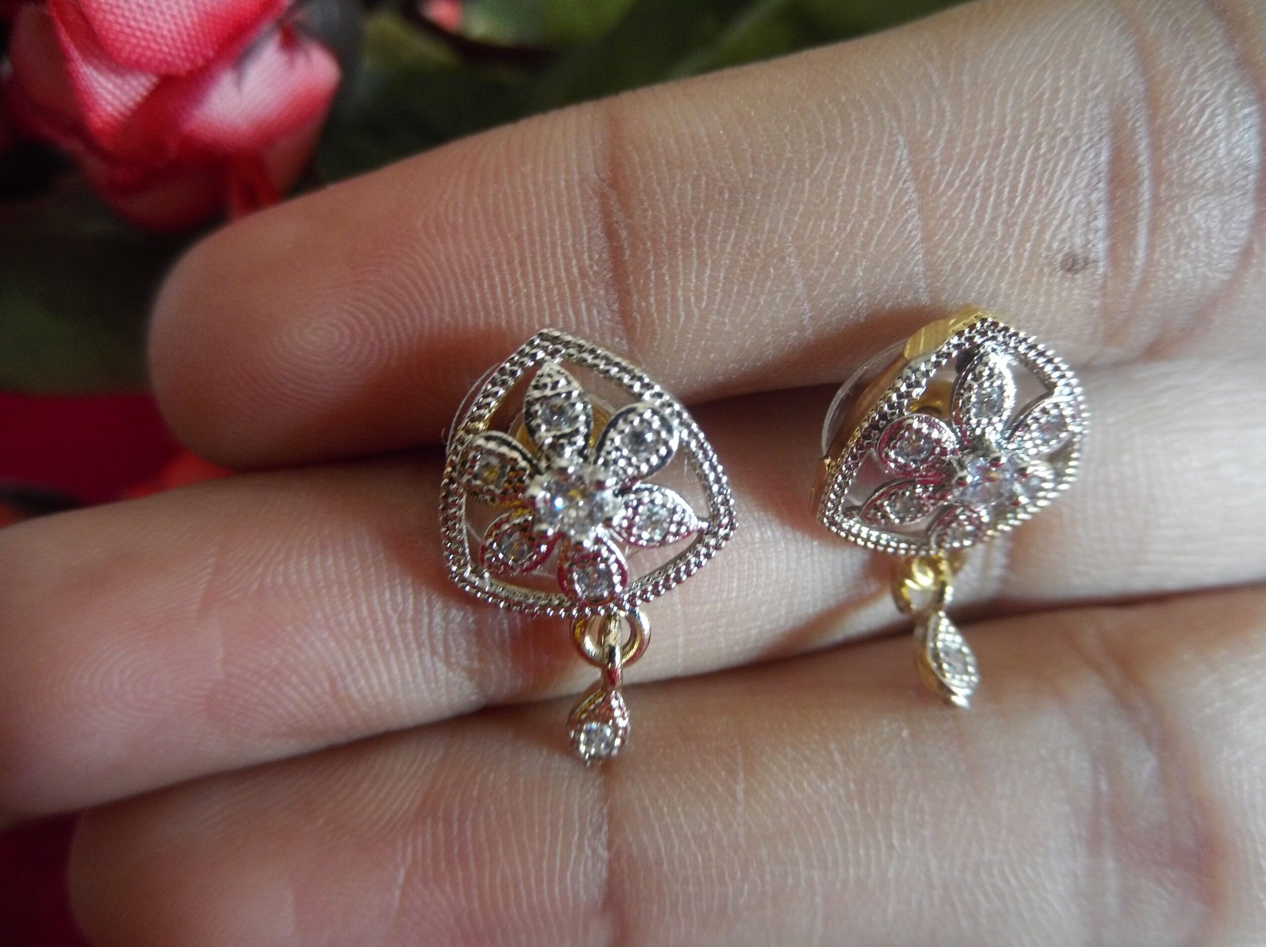 But the allure doesn’t end there. Delicate small hanging AD drops gracefully dangle from the bottom of the earrings, creating movement and enhancing the overall beauty of the piece. The combination of the golden color with the silver metal creates a striking contrast that further elevates the elegance of these earrings.