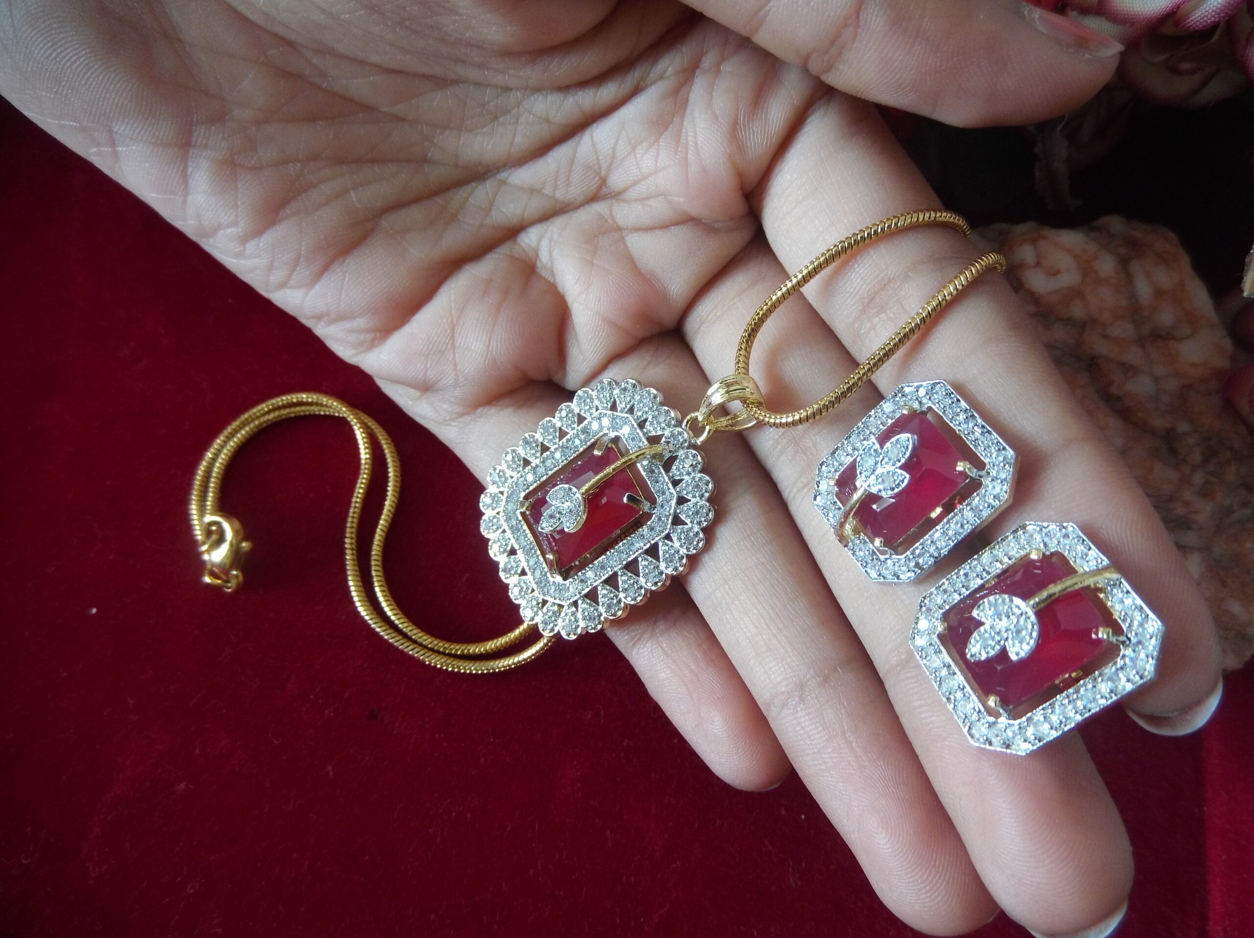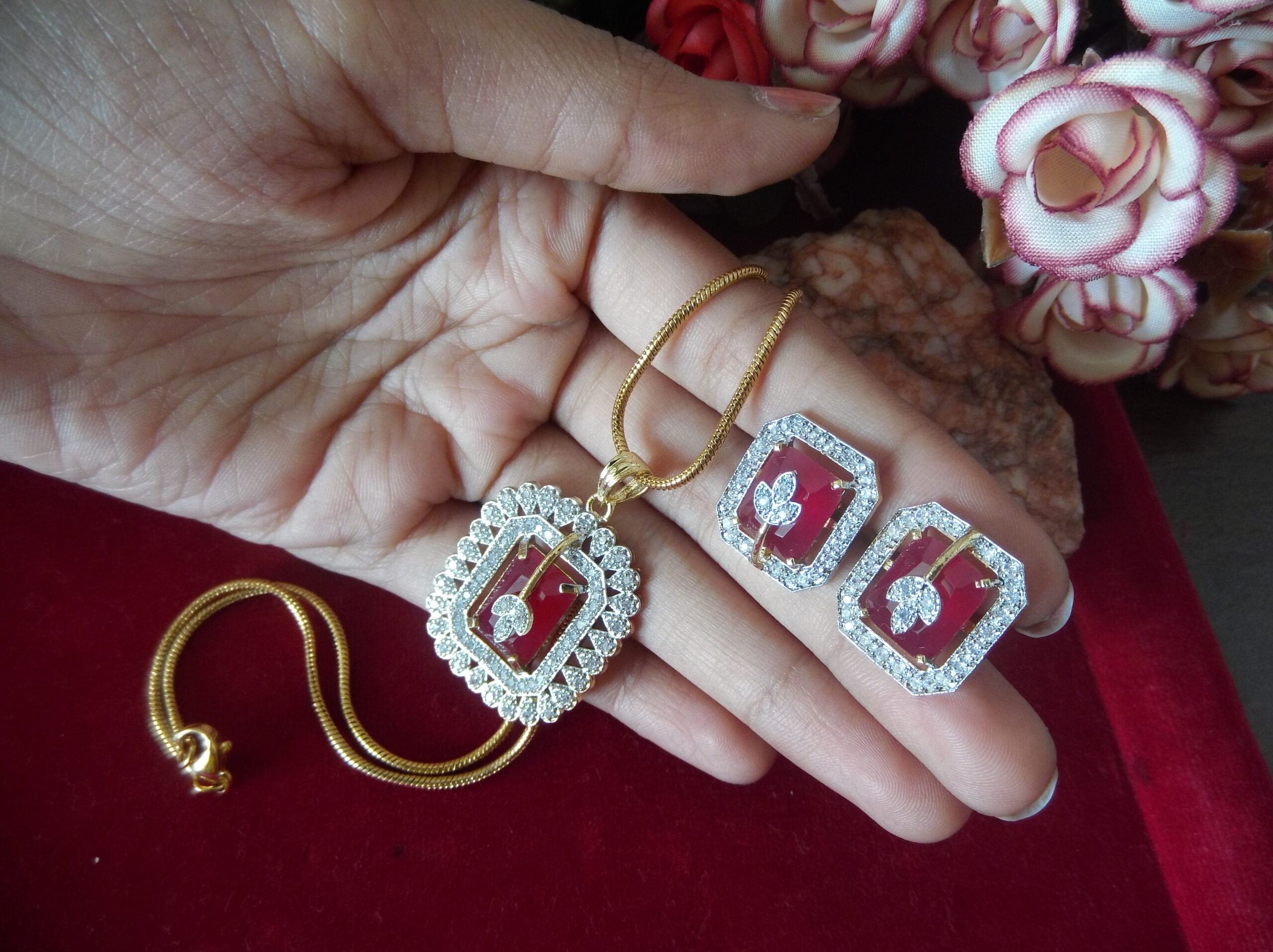 Introducing our exquisite Golden Chain and Pendant Earring Set, where sophistication meets timeless beauty. This set features meticulously designed earrings and a pendant, crafted from high-quality silver metal, adorned with intricate details. Each piece is embellished with stunning ruby-colored stones, exuding a captivating charm.