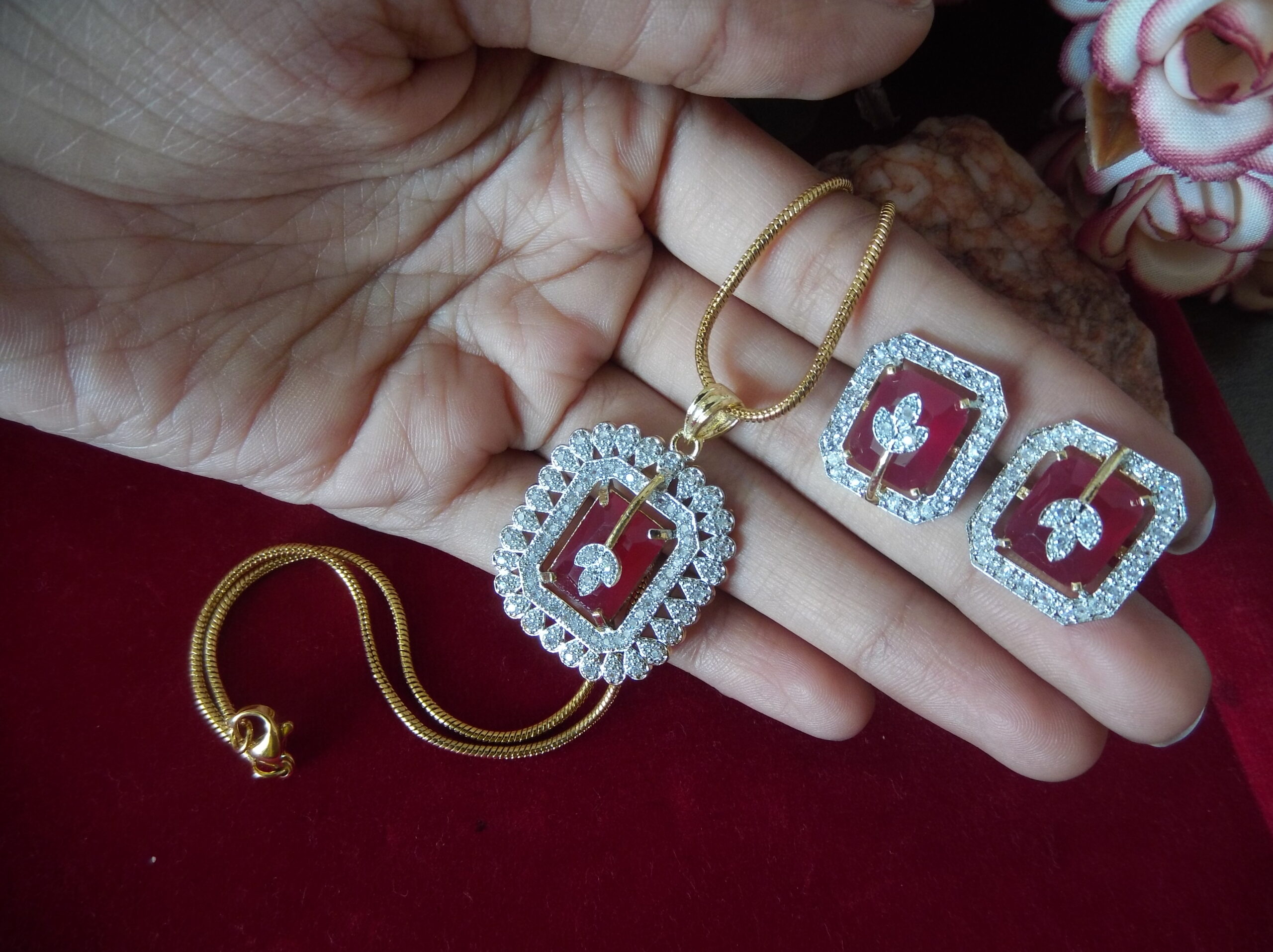 Discover elegance redefined with our Golden Chain and Pendant Earring Set. Crafted with intricate detail, the pendant and earrings feature a stunning silver metal design adorned with beautiful ruby-colored stones. Each stone is delicately embraced by white metal leaves, enhancing its allure. Perfect for adding a touch of sophistication to any outfit, this set is sure to turn heads and leave a lasting impression.