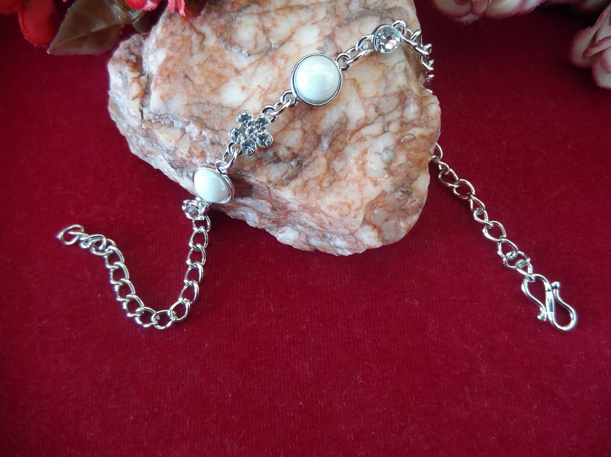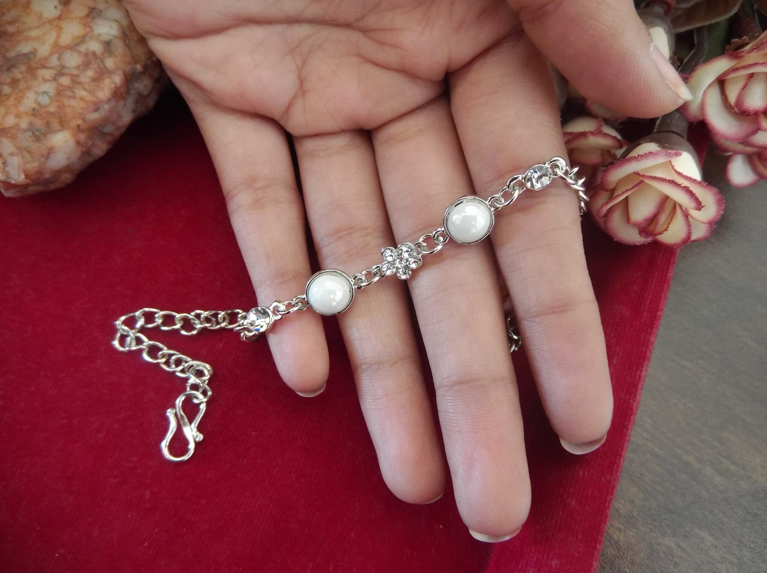 Indulge in the epitome of elegance with our Silver Metal Ladies Chain Bead Bracelet, a masterpiece of craftsmanship and style. This bracelet features a stunning centerpiece adorned with a captivating metal flower design, accented by shimmering white stones that exude sophistication and grace.