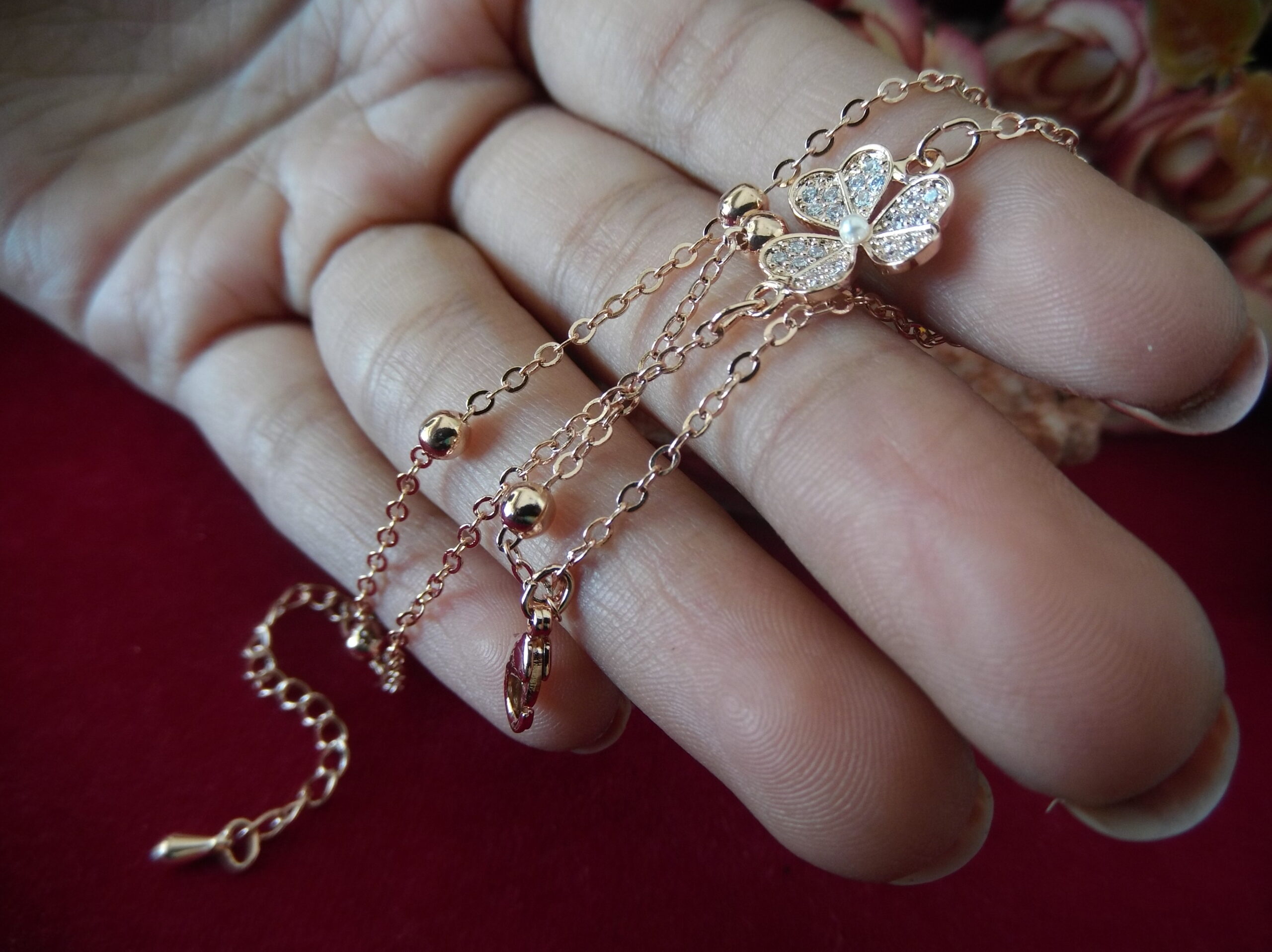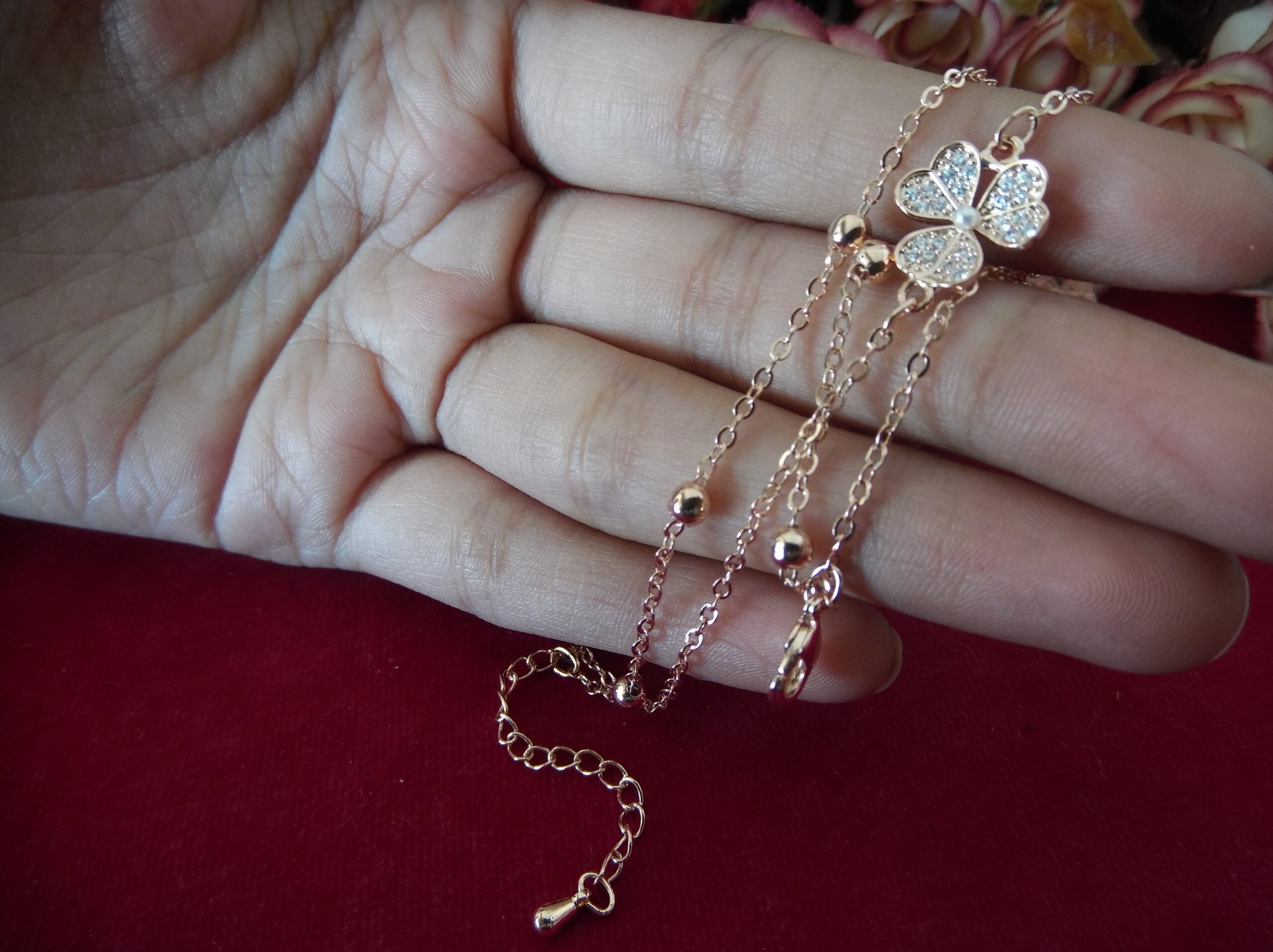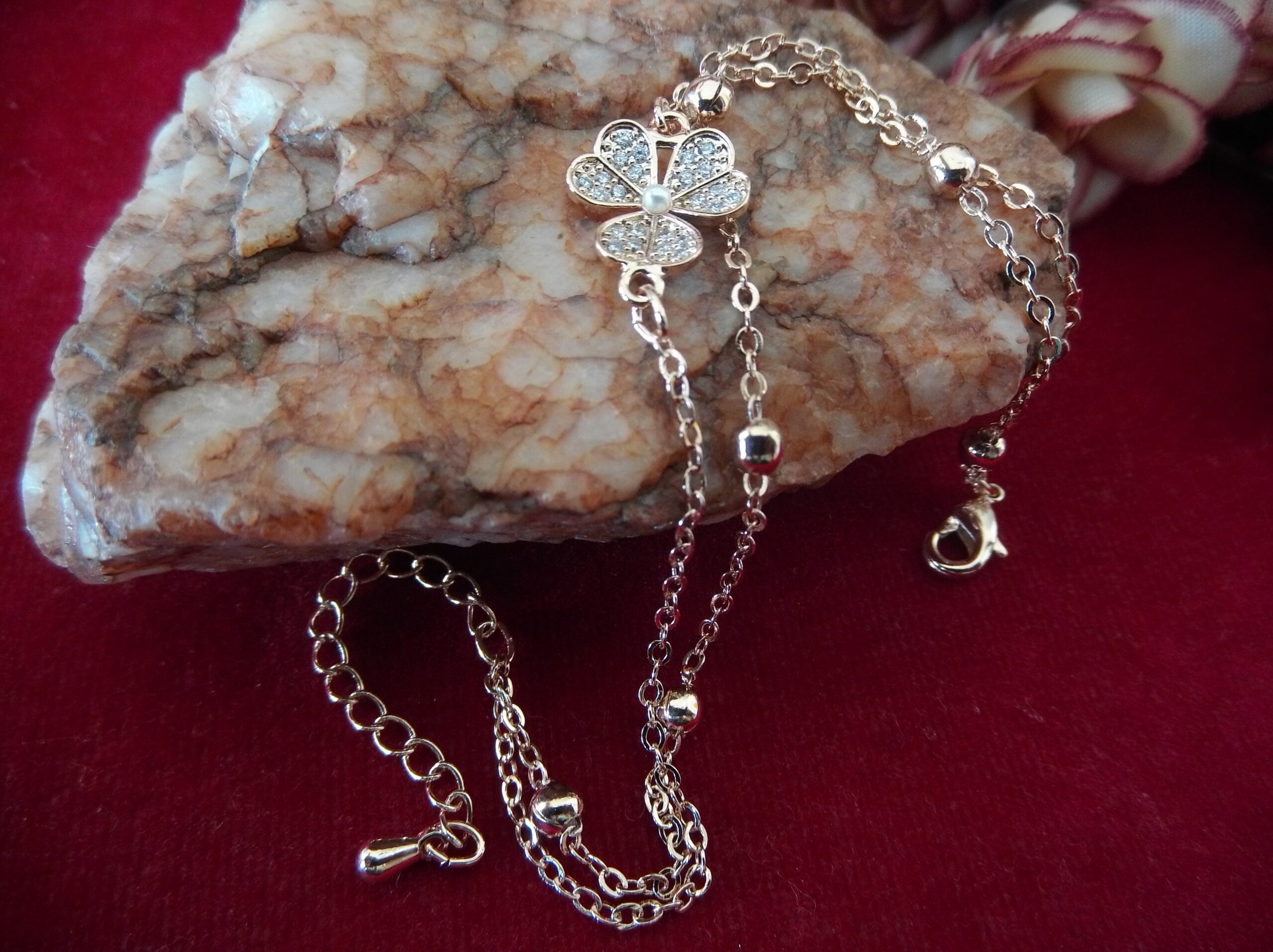 Step into elegance with our exquisite Rose Gold Metal Ladies Chain Bead Bracelet, a true testament to refined beauty and sophistication. Crafted with meticulous attention to detail, this bracelet features a stunning matte flower design at its center, adorned with sparkling stones that capture the light with every movement.