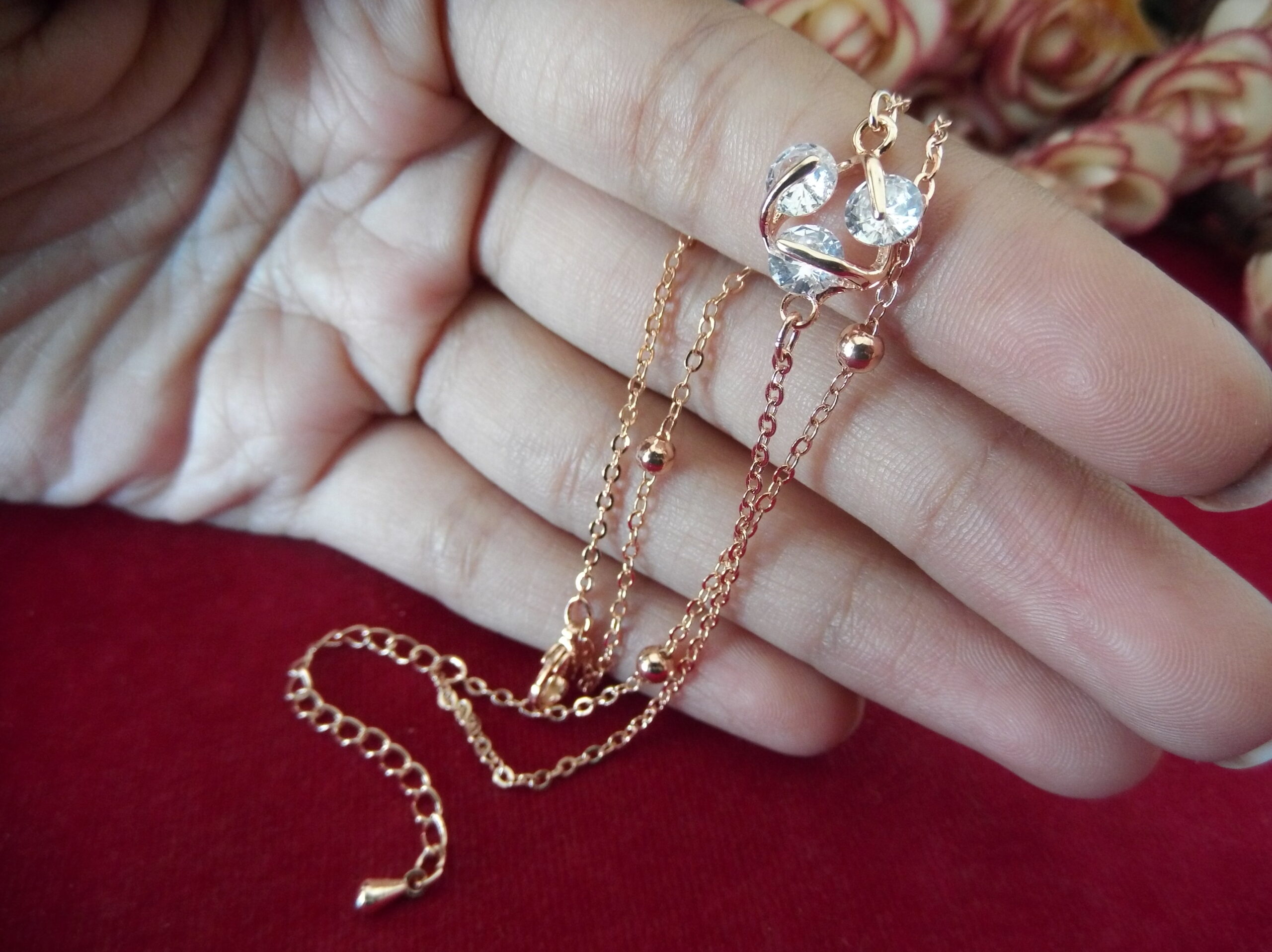 Introducing our captivating Rose Gold Metal Ladies Chain Bead Bracelet, a statement piece that effortlessly combines elegance and sophistication. At its heart lies a beautiful arrangement of three sparkling stones, delicately locked within matte metal settings, creating a mesmerizing focal point. Surrounding these stones are small metal balls, adding an extra dimension of texture and allure to the bracelet. Each detail exudes refinement and grace, elevating your ensemble with understated glamour. Whether worn alone or paired with other accessories, this bracelet is sure to enhance your style and elevate your look with timeless elegance.
