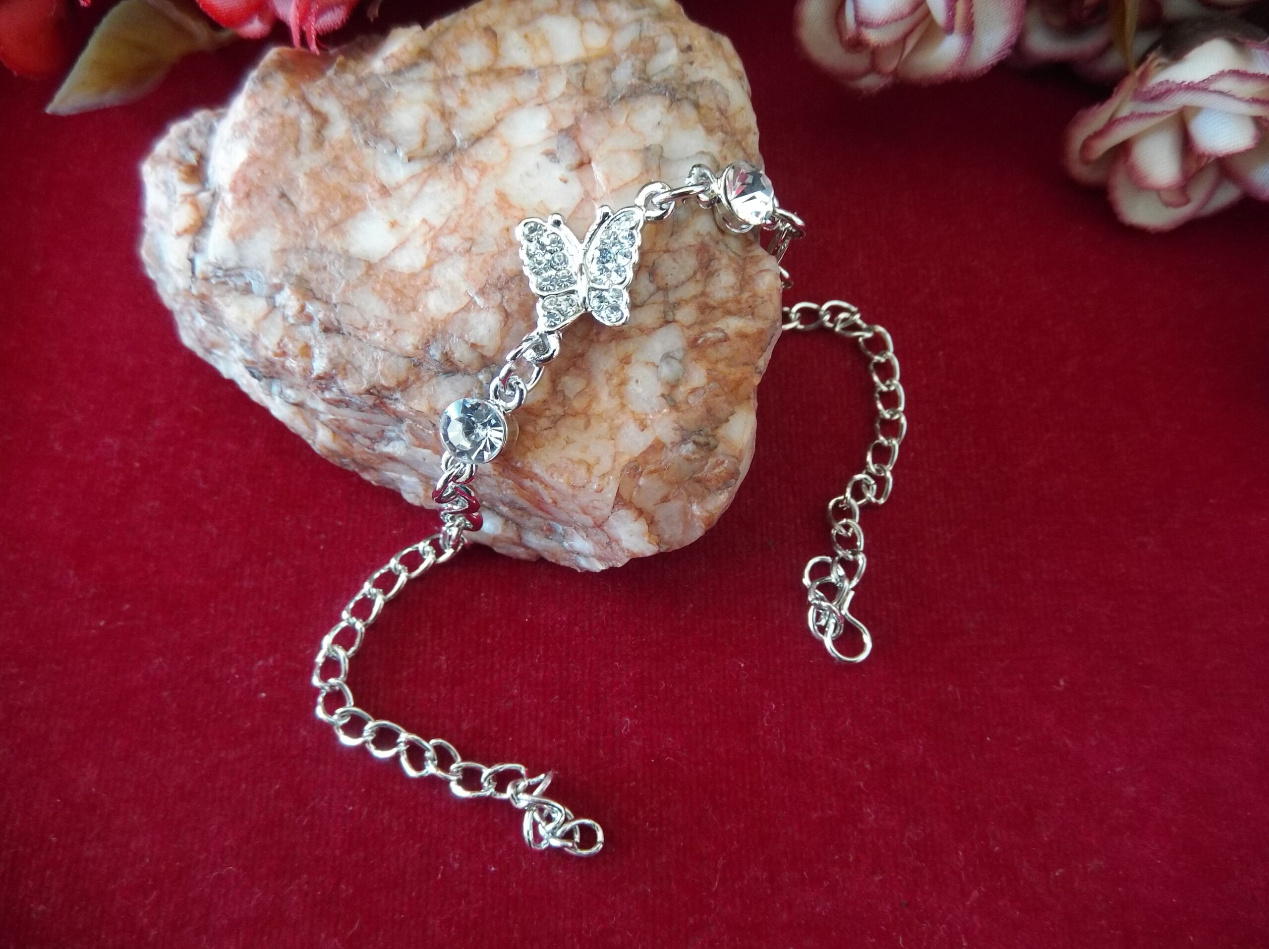 Immerse yourself in elegance with our Silver Metal Ladies Chain Bead Bracelet, a captivating piece designed to elevate your style. At its center lies a breathtaking metal butterfly adorned with dazzling white stones, exuding a timeless charm. Delicately inscribed in white metal, the word “love” adds a sentimental touch, making this bracelet a perfect gift for someone special. With sparkling white stones adorning both sides, this bracelet catches the light with every movement, adding a subtle yet stunning sparkle to your look. Crafted with attention to detail, this bracelet is a true symbol of sophistication and grace. Wear it alone for a subtle statement or stack it with other bracelets for a layered look. Embrace elegance and beauty with our Silver Metal Ladies Chain Bead Bracelet, a must-have accessory for any jewelry collection.
