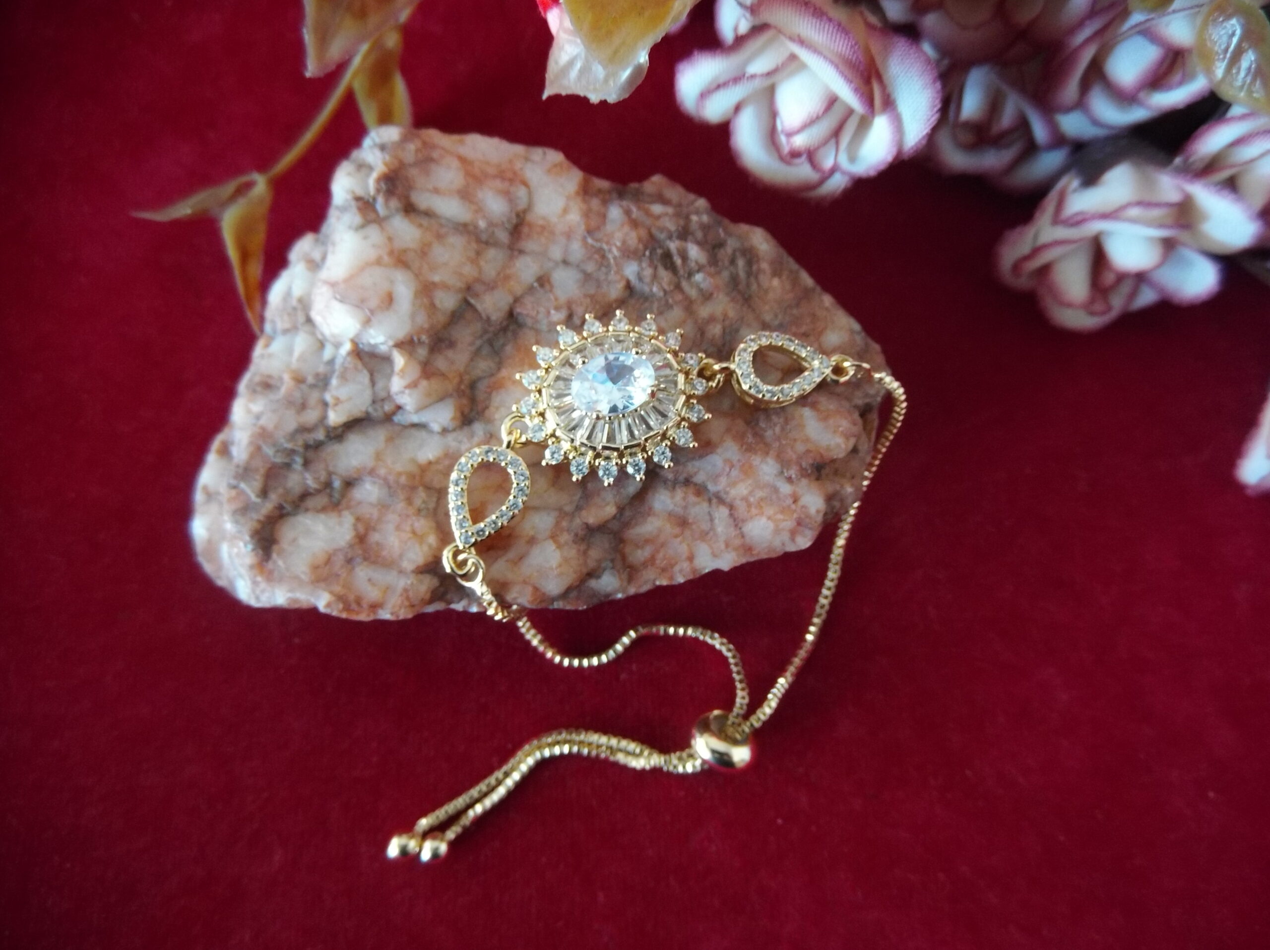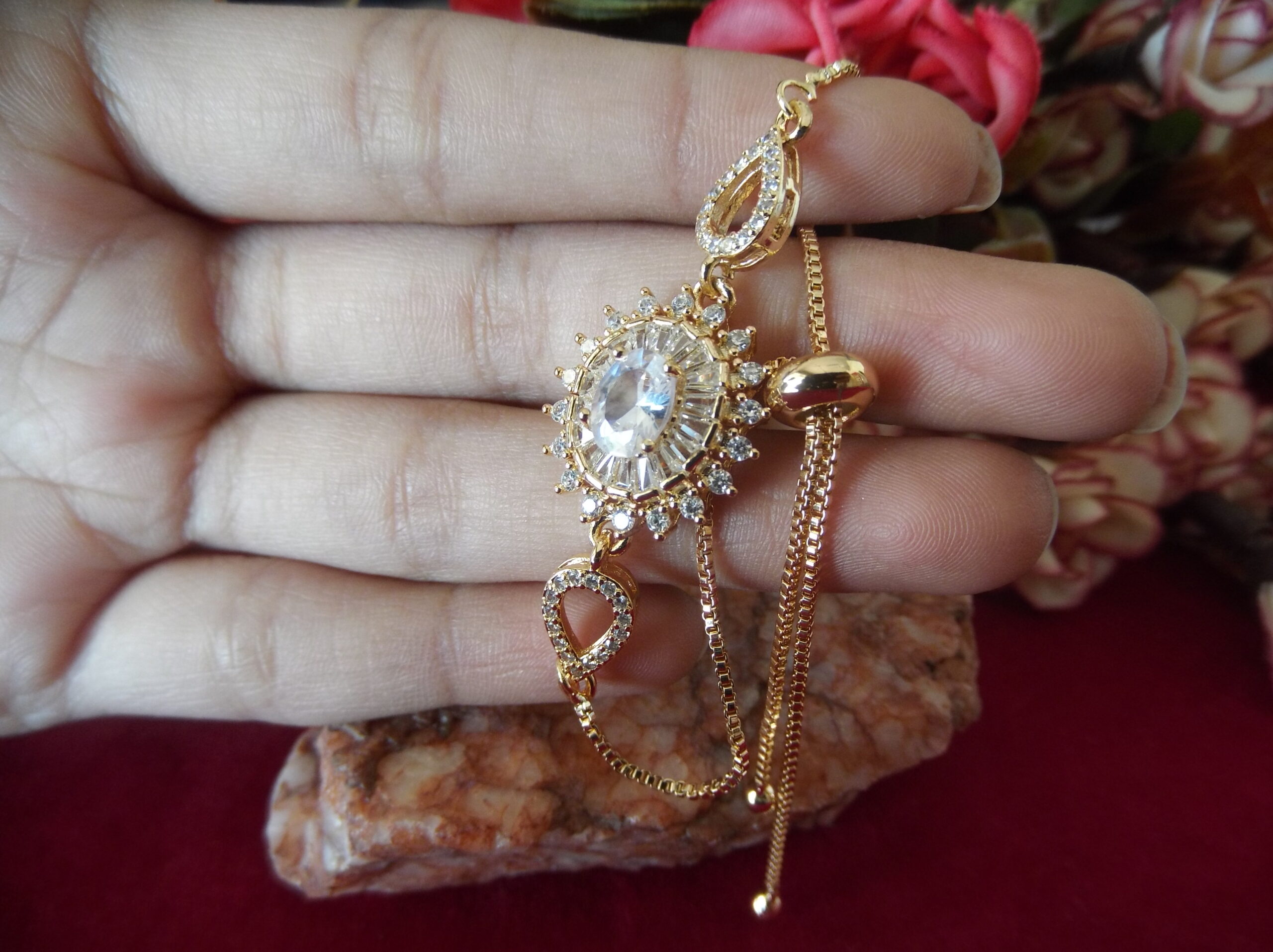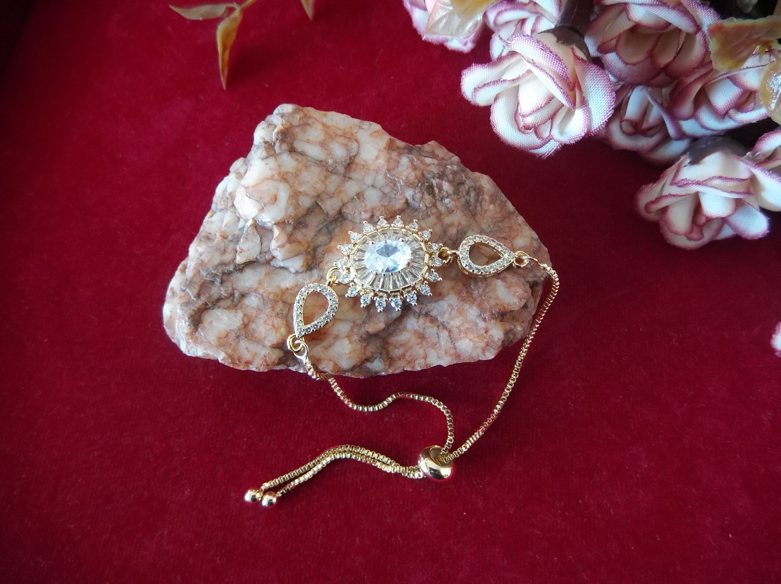 Indulge in the timeless elegance of our Golden Metal Ladies’ Chain Bead Bracelet, meticulously crafted to captivate. Adorned with a stunning floral motif embellished with delicate sparkling stones, it exudes sophistication and grace. At its heart lies a magnificent large stone, radiating brilliance and allure. Adding to its charm, intricate leafy designs gracing both sides, each adorned with exquisite tiny stones, further elevate its allure. With a convenient sliding lock mechanism, wearing this bracelet is effortless, allowing you to effortlessly exude style and grace wherever you go. Elevate your ensemble with this enchanting piece that seamlessly blends beauty and convenience.