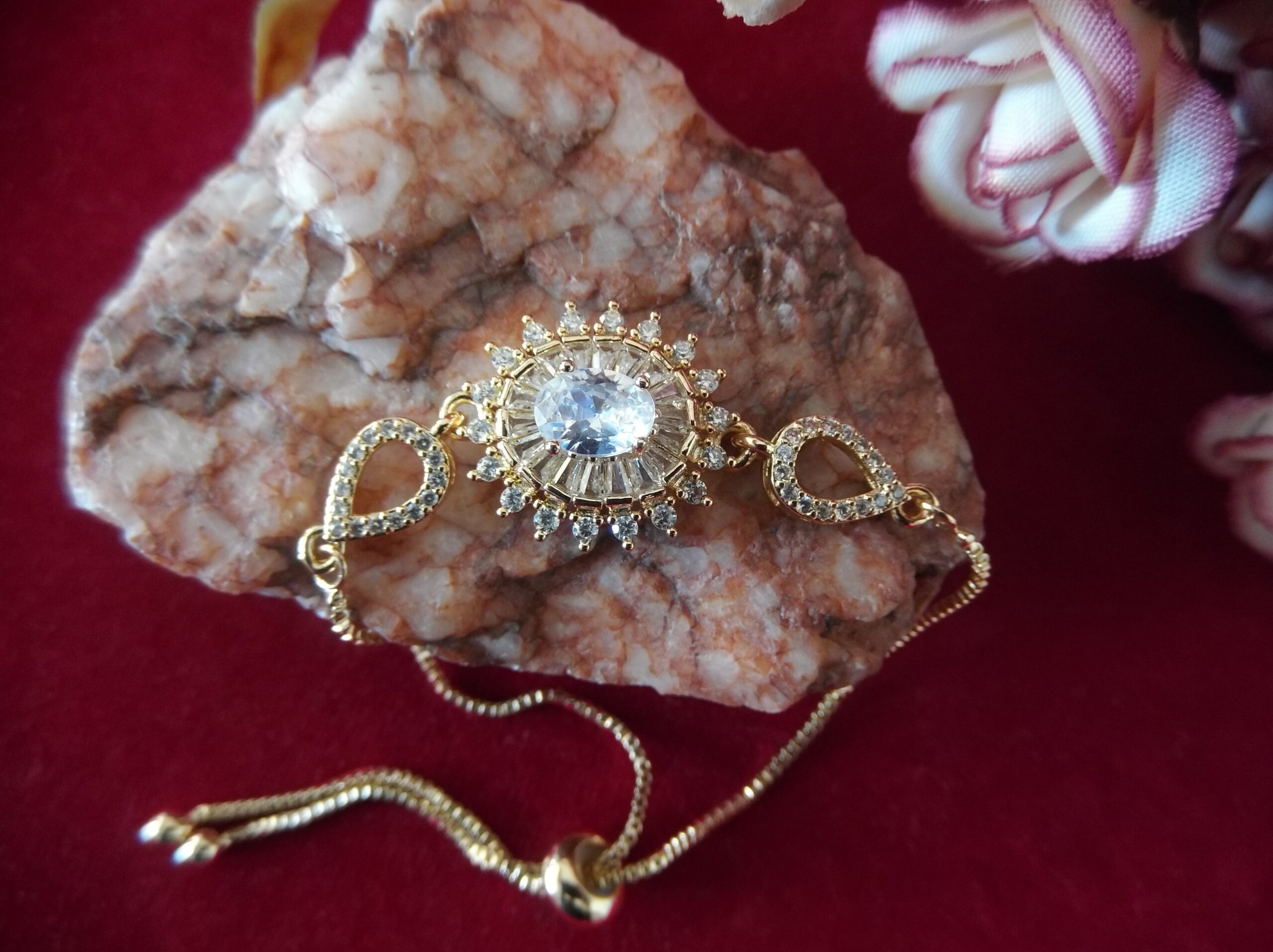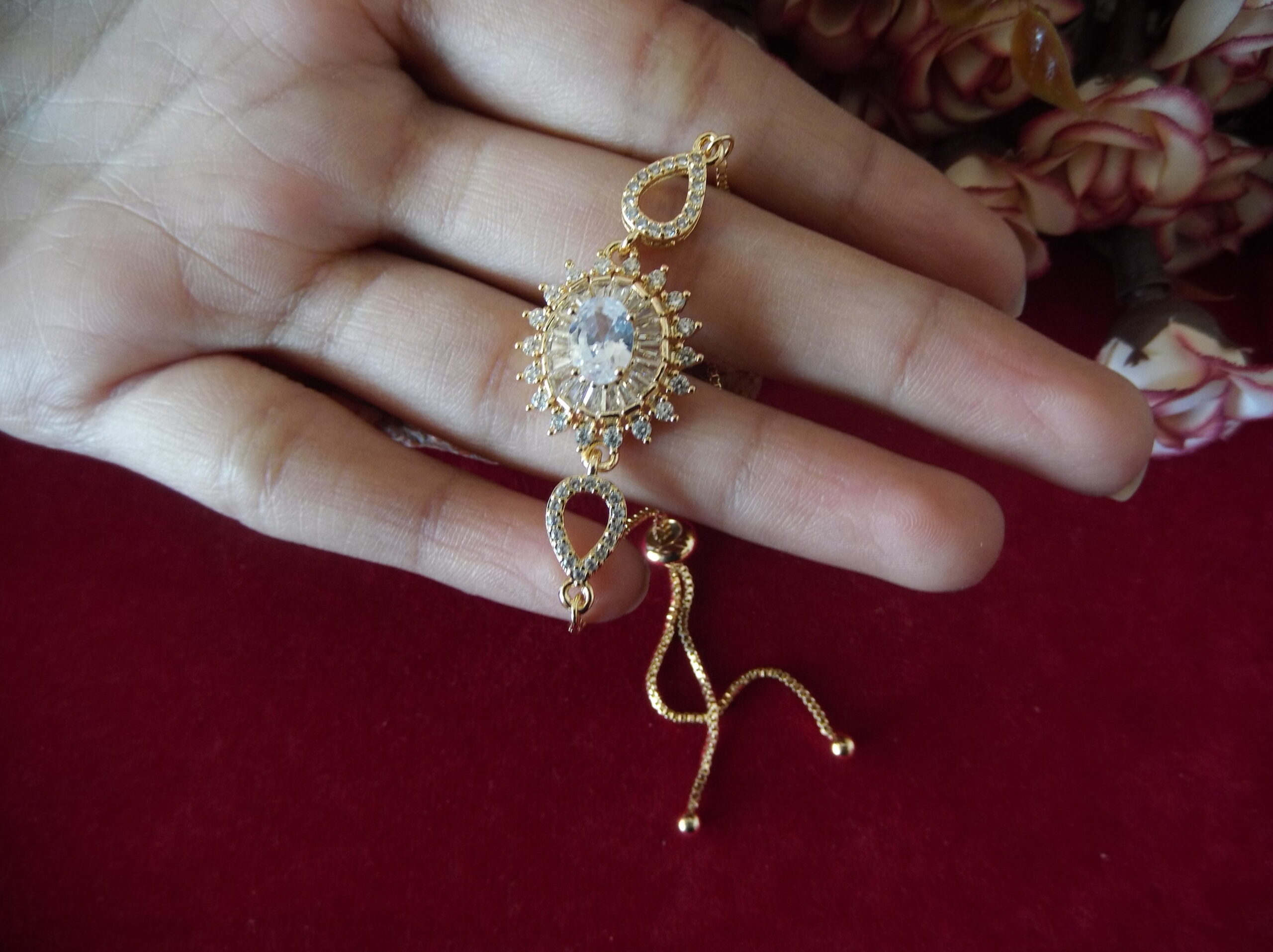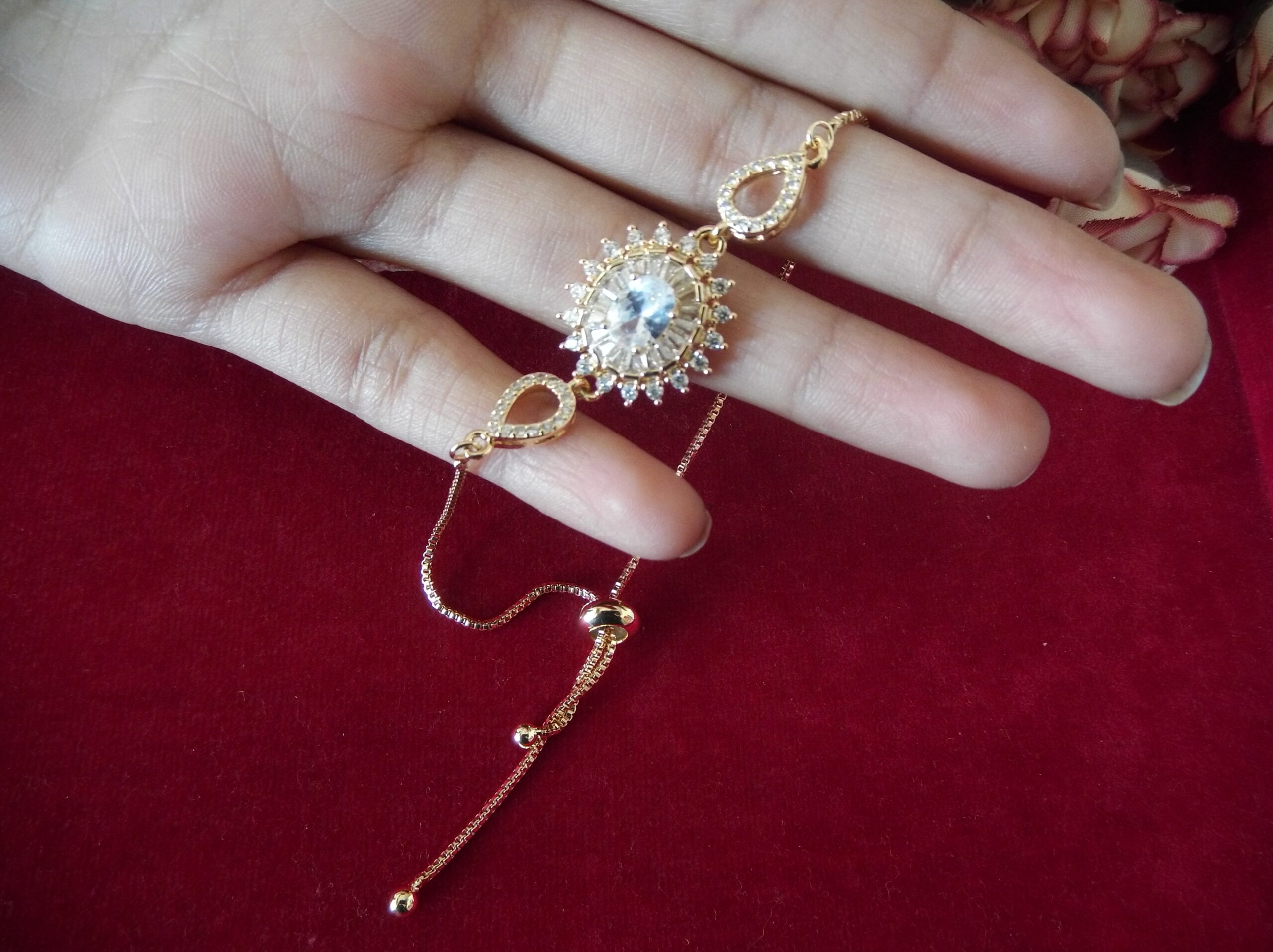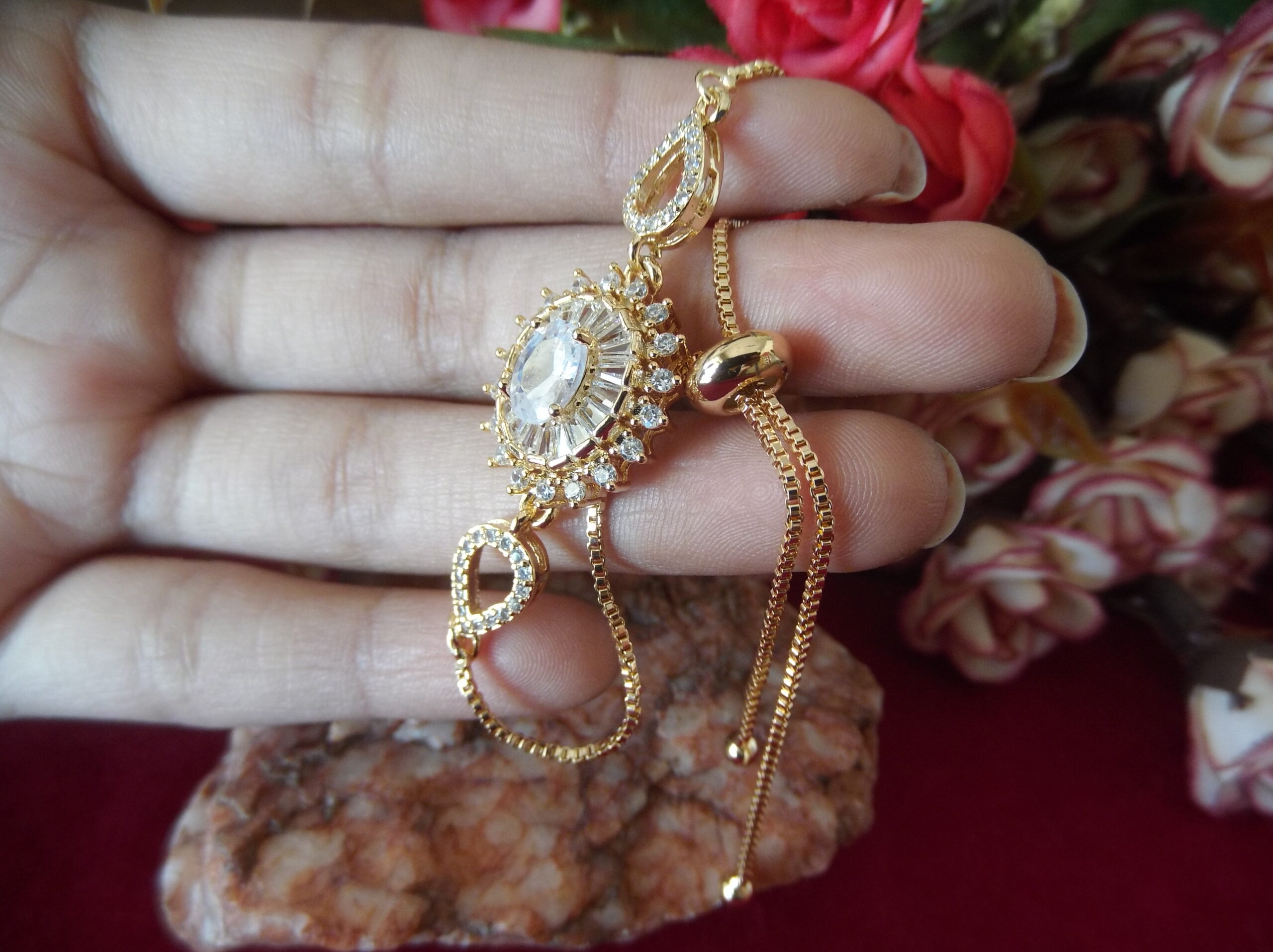 Indulge in the timeless elegance of our Golden Metal Ladies’ Chain Bead Bracelet, meticulously crafted to captivate. Adorned with a stunning floral motif embellished with delicate sparkling stones, it exudes sophistication and grace. At its heart lies a magnificent large stone, radiating brilliance and allure. Adding to its charm, intricate leafy designs gracing both sides, each adorned with exquisite tiny stones, further elevate its allure. With a convenient sliding lock mechanism, wearing this bracelet is effortless, allowing you to effortlessly exude style and grace wherever you go. Elevate your ensemble with this enchanting piece that seamlessly blends beauty and convenience.