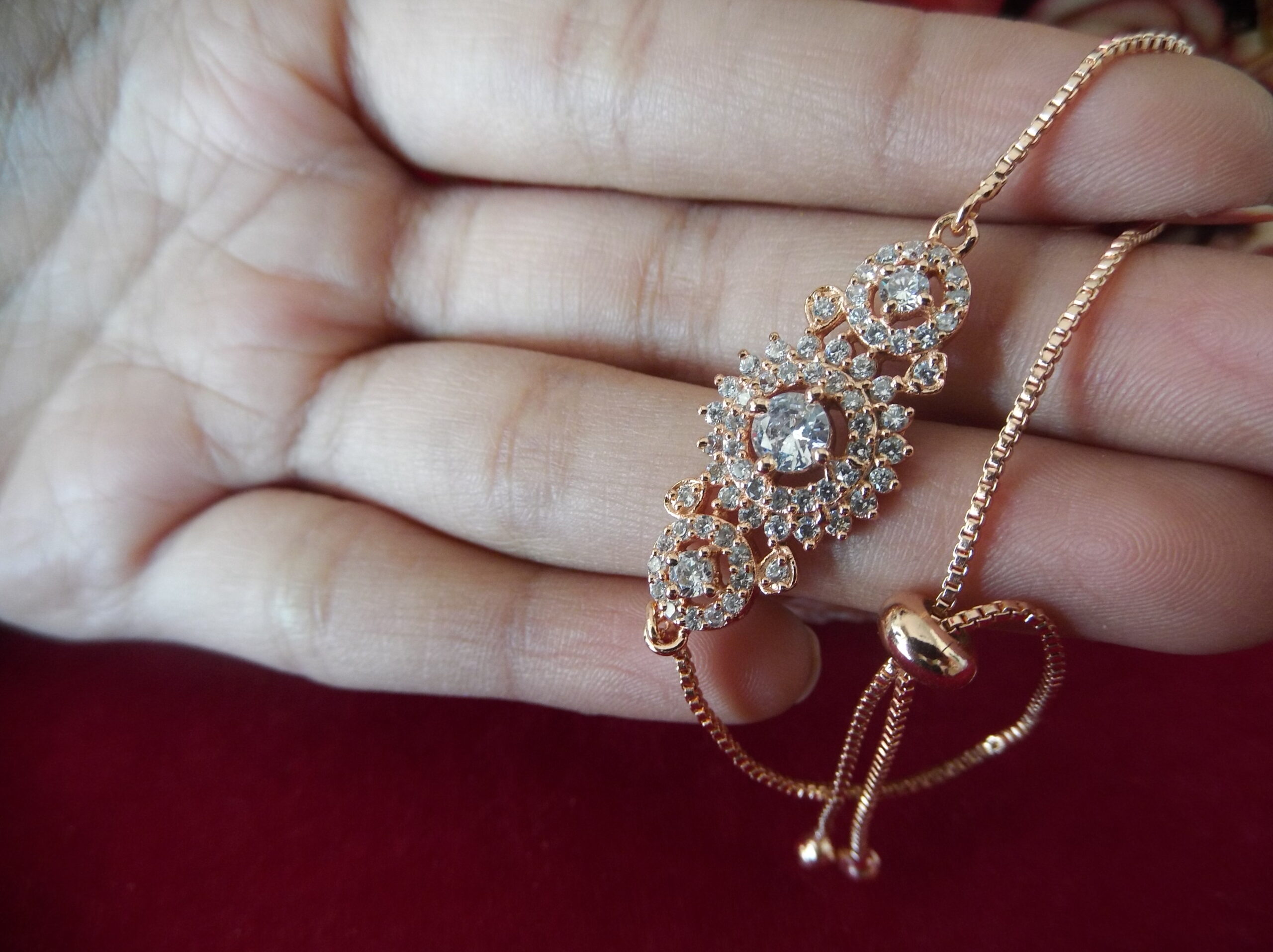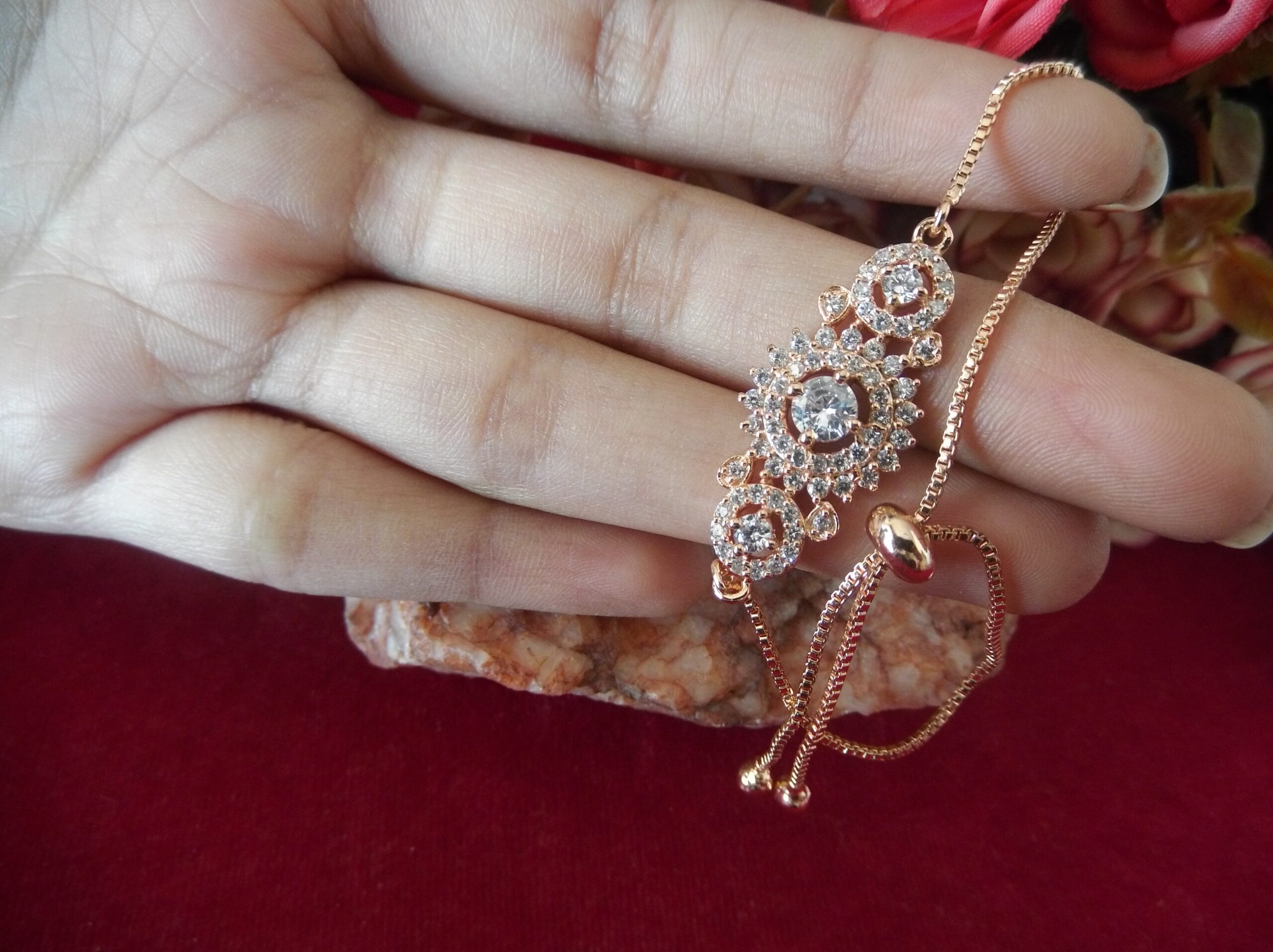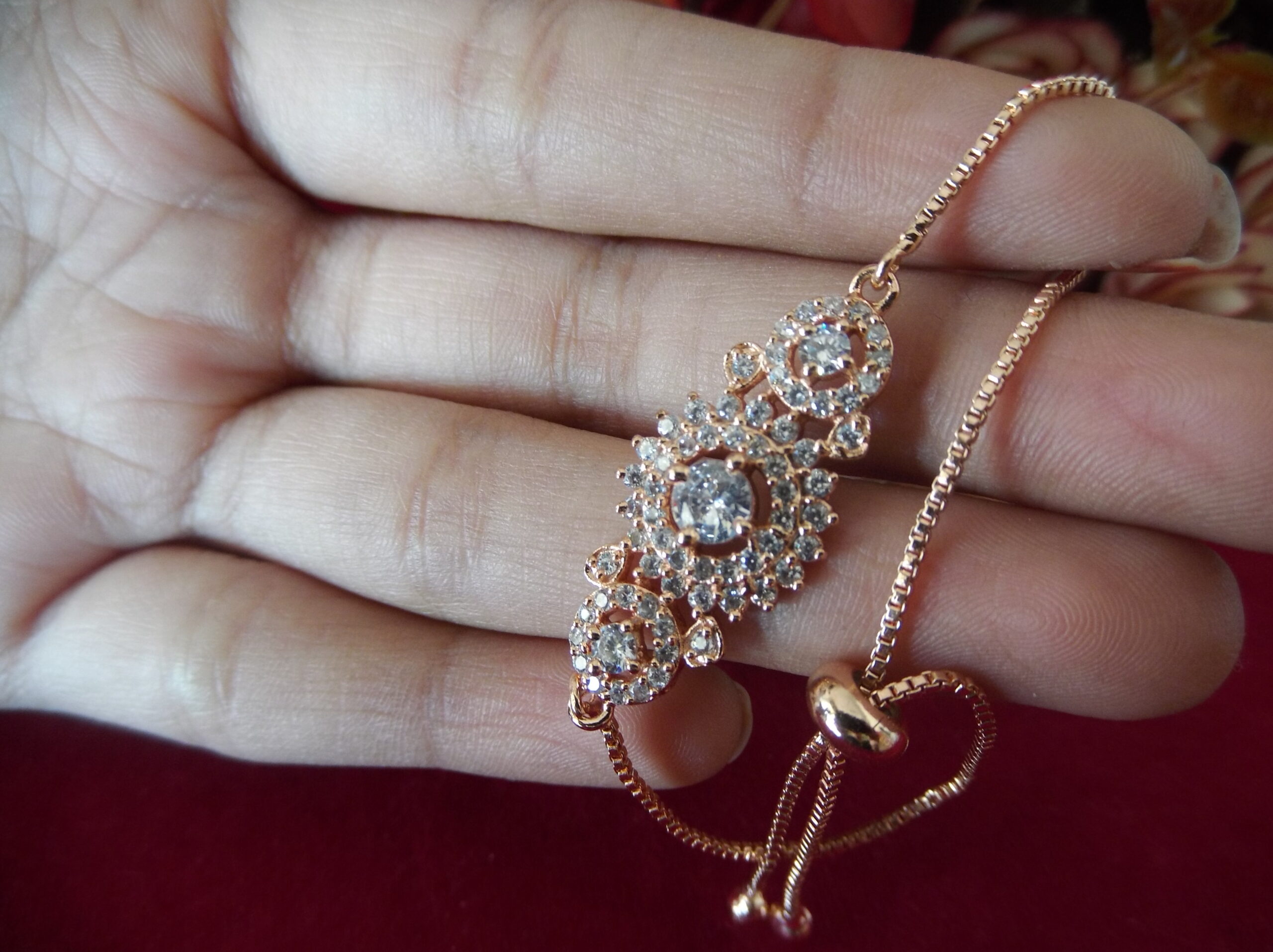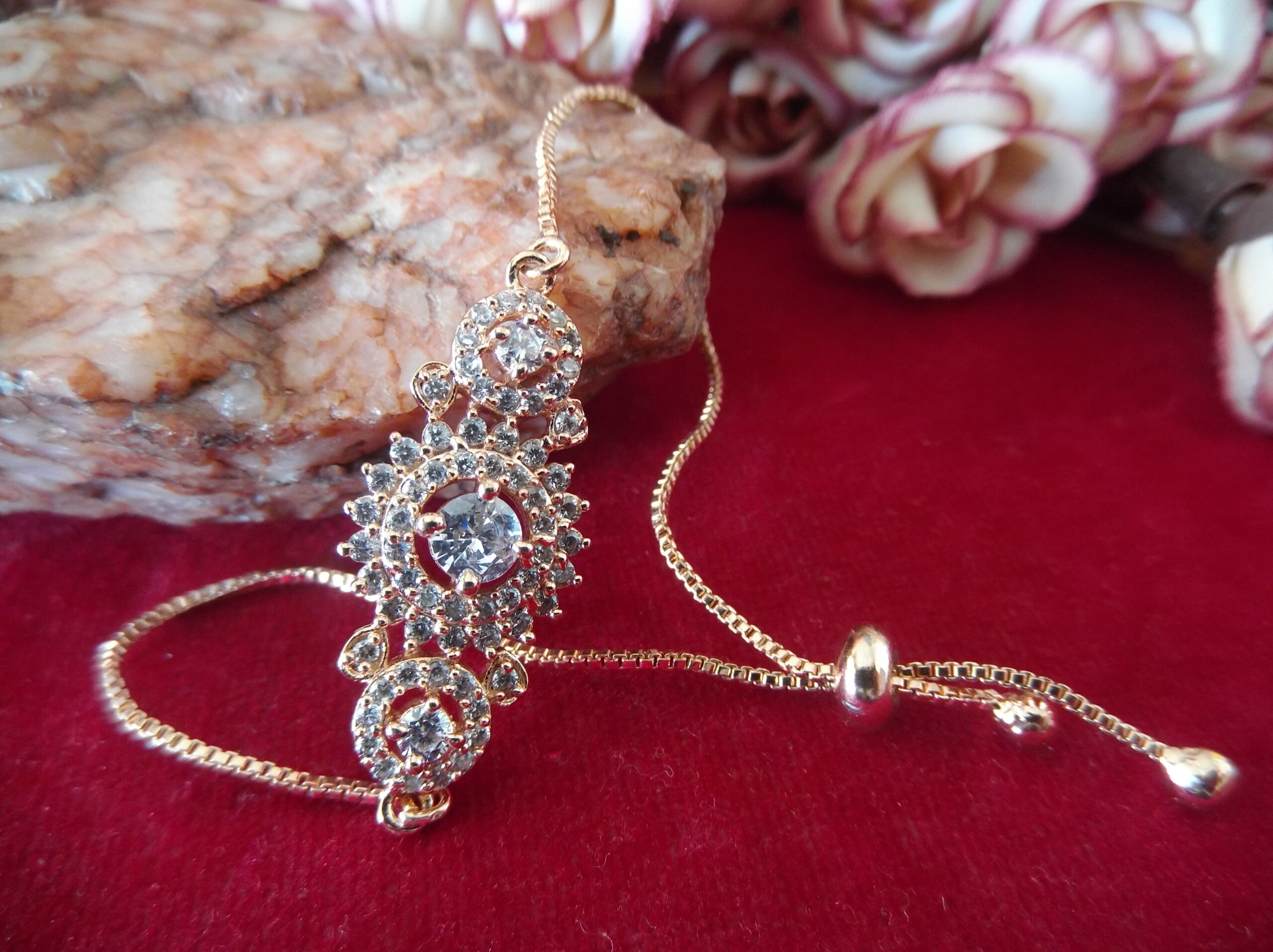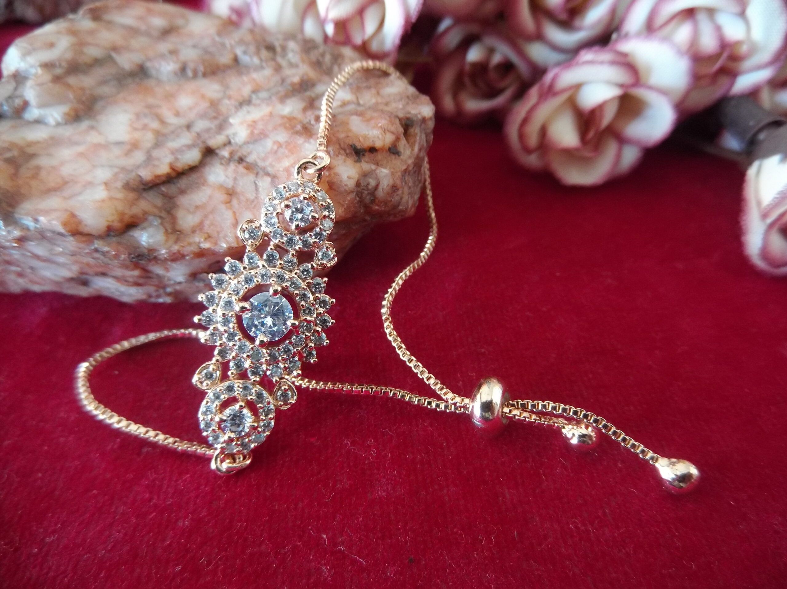 Create 1 unique high converting long product description for golden coler matel lades chain besd breslet and in middel beautifull flower digin with small sprkling stone and in middel a big stone and both side round digen with very smoll stonssliding lock make it canviniant to wear