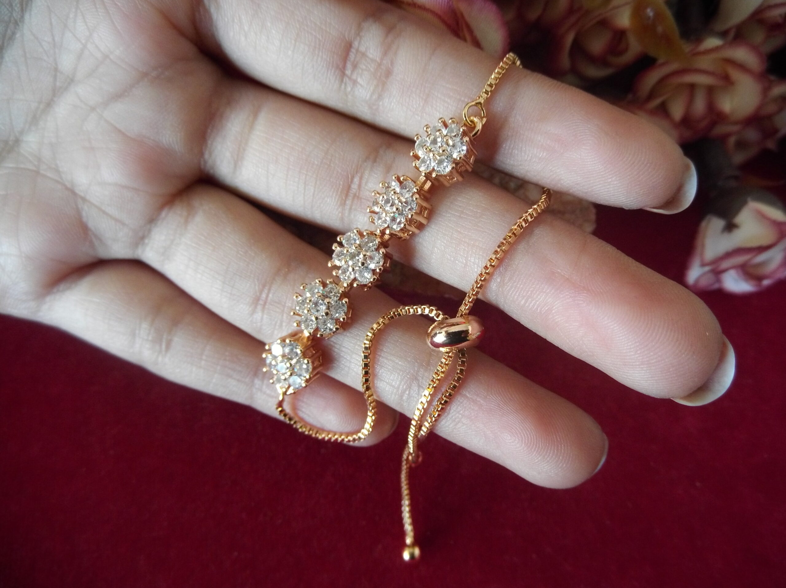 Introducing our exquisite Golden Metal Ladies’ Chain Bead Bracelet, a harmonious blend of elegance and charm that’s bound to enchant. Adorning this bracelet are five delicate flower designs, each intricately crafted with small sparkling stones that shimmer and dance in the light, adding a touch of glamour to your ensemble. The sliding lock mechanism ensures effortless wearability, providing a secure and comfortable fit for any occasion. Elevate your style with this timeless accessory, exuding sophistication and grace with every wear. Whether worn alone or paired with other jewelry pieces, this bracelet is sure to make a statement and become a cherished addition to your collection.