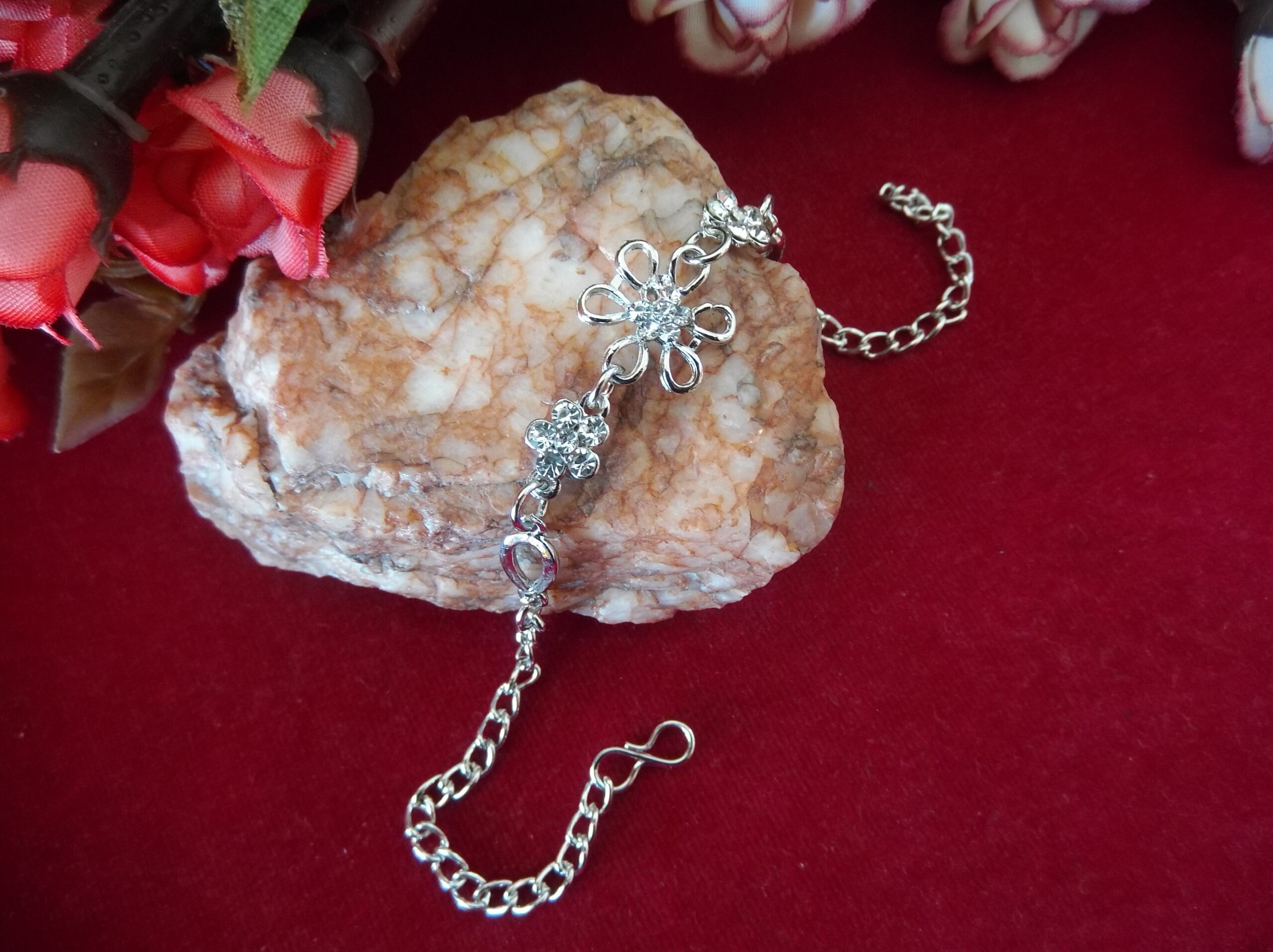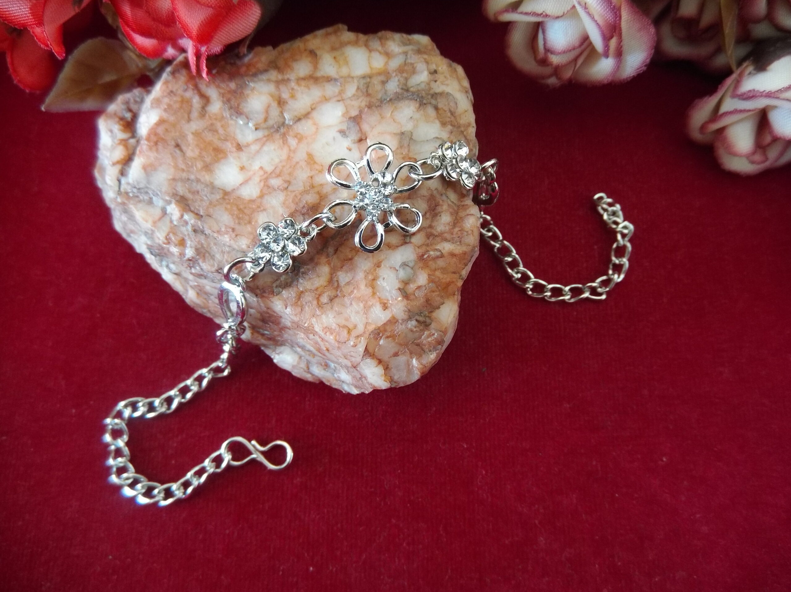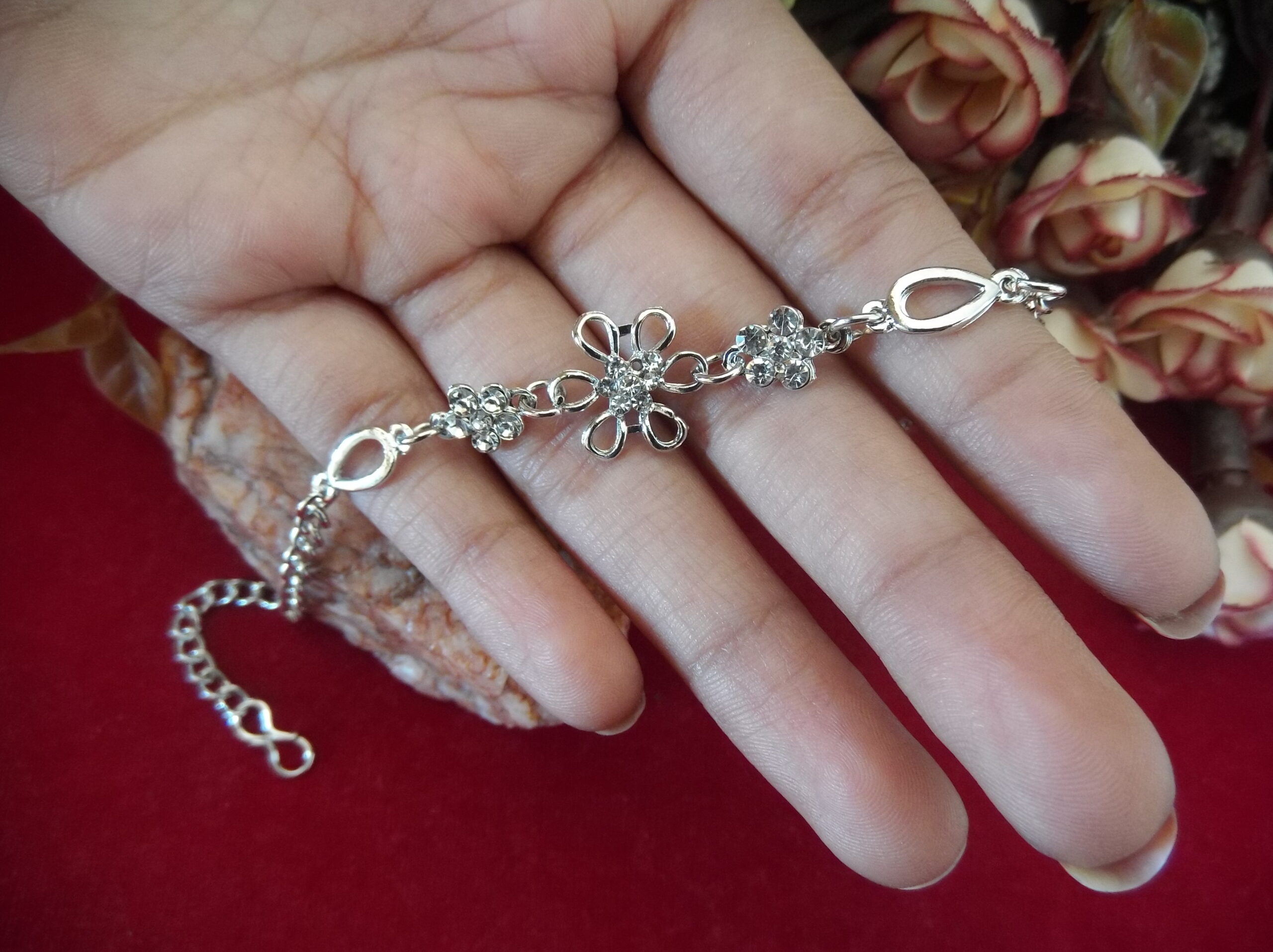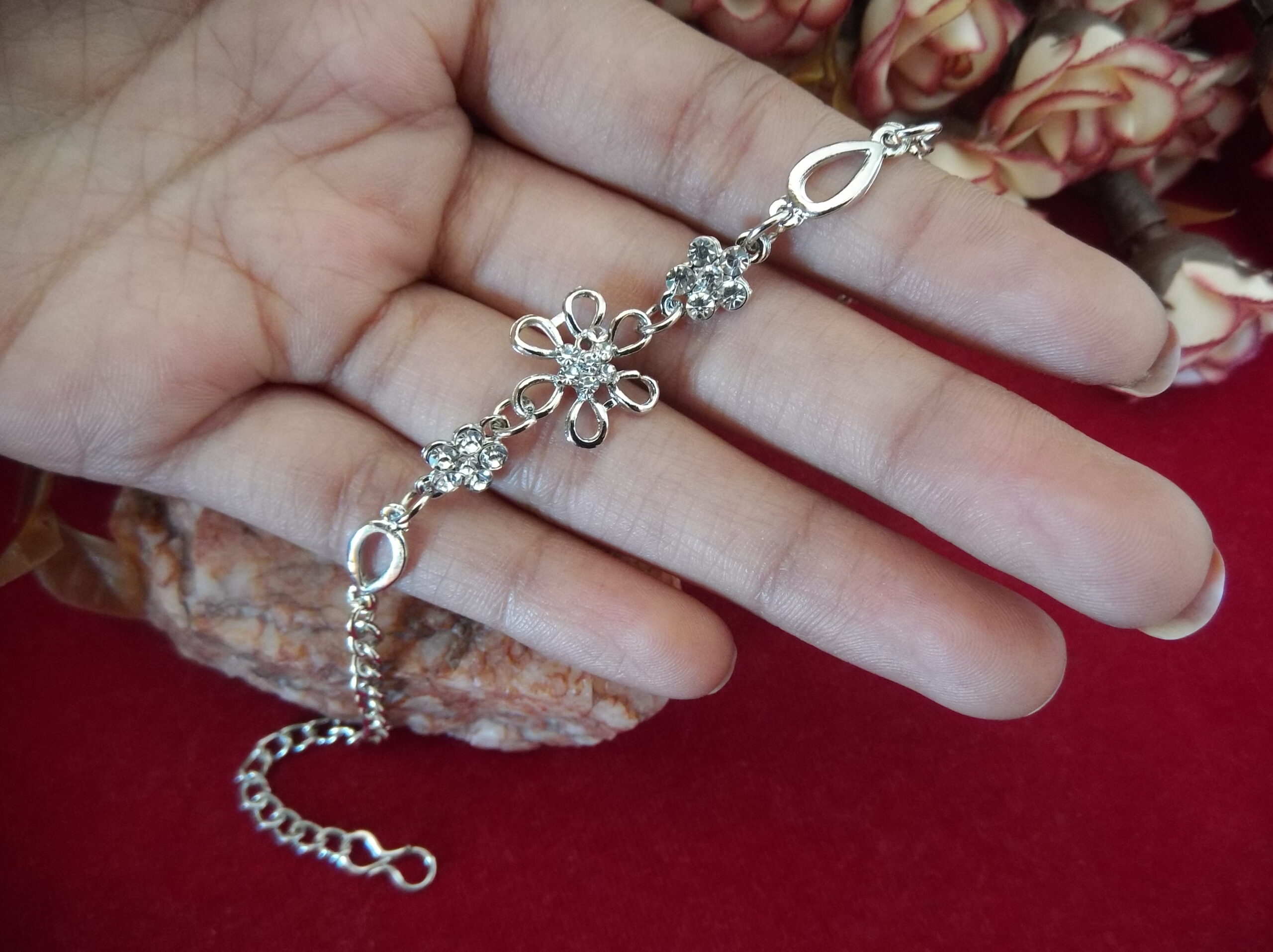 Each delicate petal is meticulously crafted, embracing shimmering white stones that add a touch of brilliance to the piece. But the allure doesn’t stop there. On both sides of the central flower, you’ll find intricately detailed metal flowers adorned with sparkling stones, enhancing the bracelet’s allure from every angle.