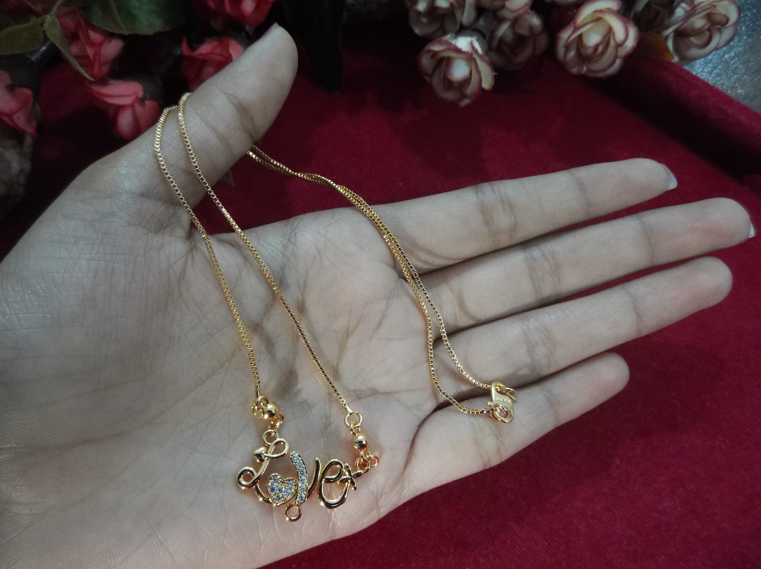 Embrace the beauty of love with our Ladies Golden Chain with Pendant, a radiant expression of affection and elegance. Crafted from high-quality materials, this exquisite chain features a dazzling pendant adorned with sparkling stones that dazzle in the light. Adding to its charm, the pendant is embellished with a beautifully crafted “love” word, symbolizing the timeless bond shared between two hearts. Whether worn as a romantic gesture or as a personal reminder of love’s enduring power, this golden chain with pendant is sure to captivate and inspire.
