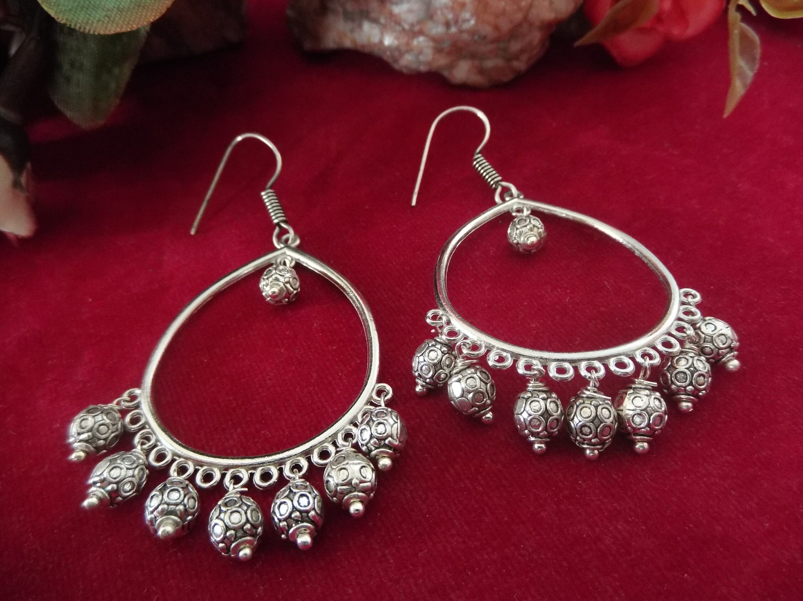 The silver oxidized finish lends a touch of vintage charm to the design, adding depth and dimension to the overall aesthetic. Each metallic ball is intricately detailed, reflecting light with subtle brilliance and catching the eye with every movement.