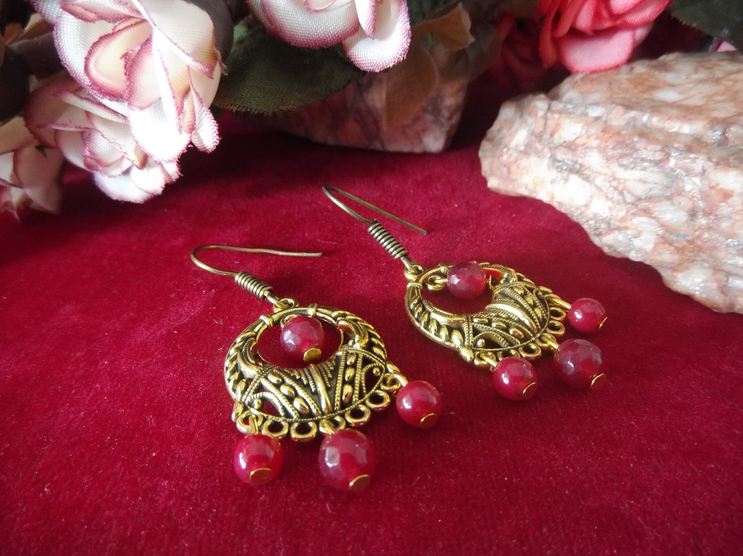 The golden oxidized finish adds a hint of vintage-inspired charm to these earrings, while the dangling red beads infuse a modern flair. Each bead is carefully selected for its rich hue and exquisite shine, adding a pop of color and visual interest to the ensemble.