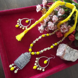 Completing the ensemble are the beautiful hanging earrings, adorned with matching tops and designed to sway gracefully with your every movement. Whether worn individually or as a set, this handcrafted masterpiece is sure to turn heads and elevate your style to new heights.