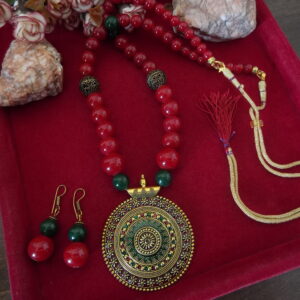 Indulge in the timeless allure of our Handmade Red Green Beaded Necklace and Earring Set, meticulously crafted to exude elegance and charm. This exquisite set features a captivating centerpiece: a striking red and green Meenakari pendant adorned with intricate detailing and complemented by delicate hanging beads, adding a touch of sophistication to any ensemble.