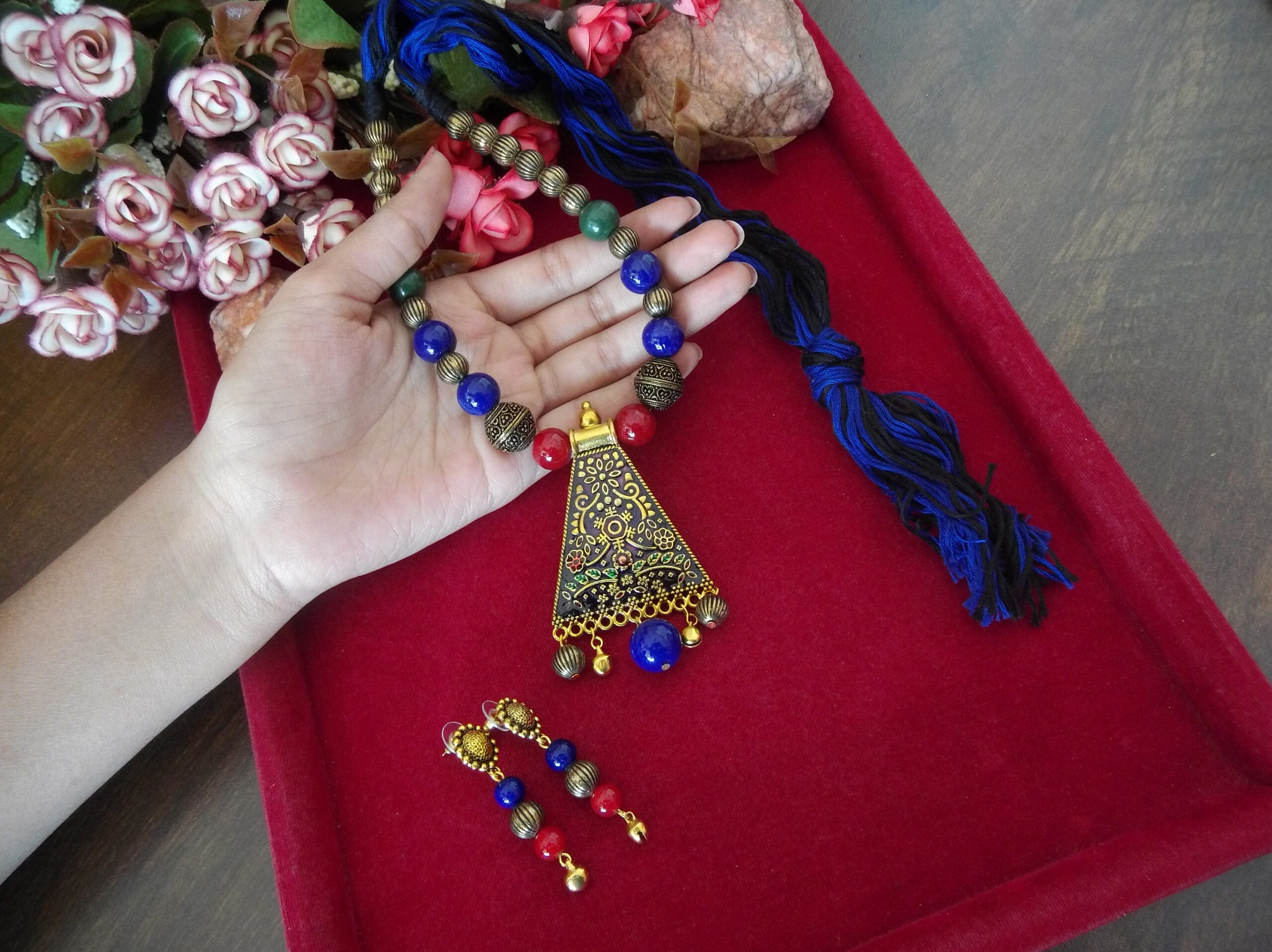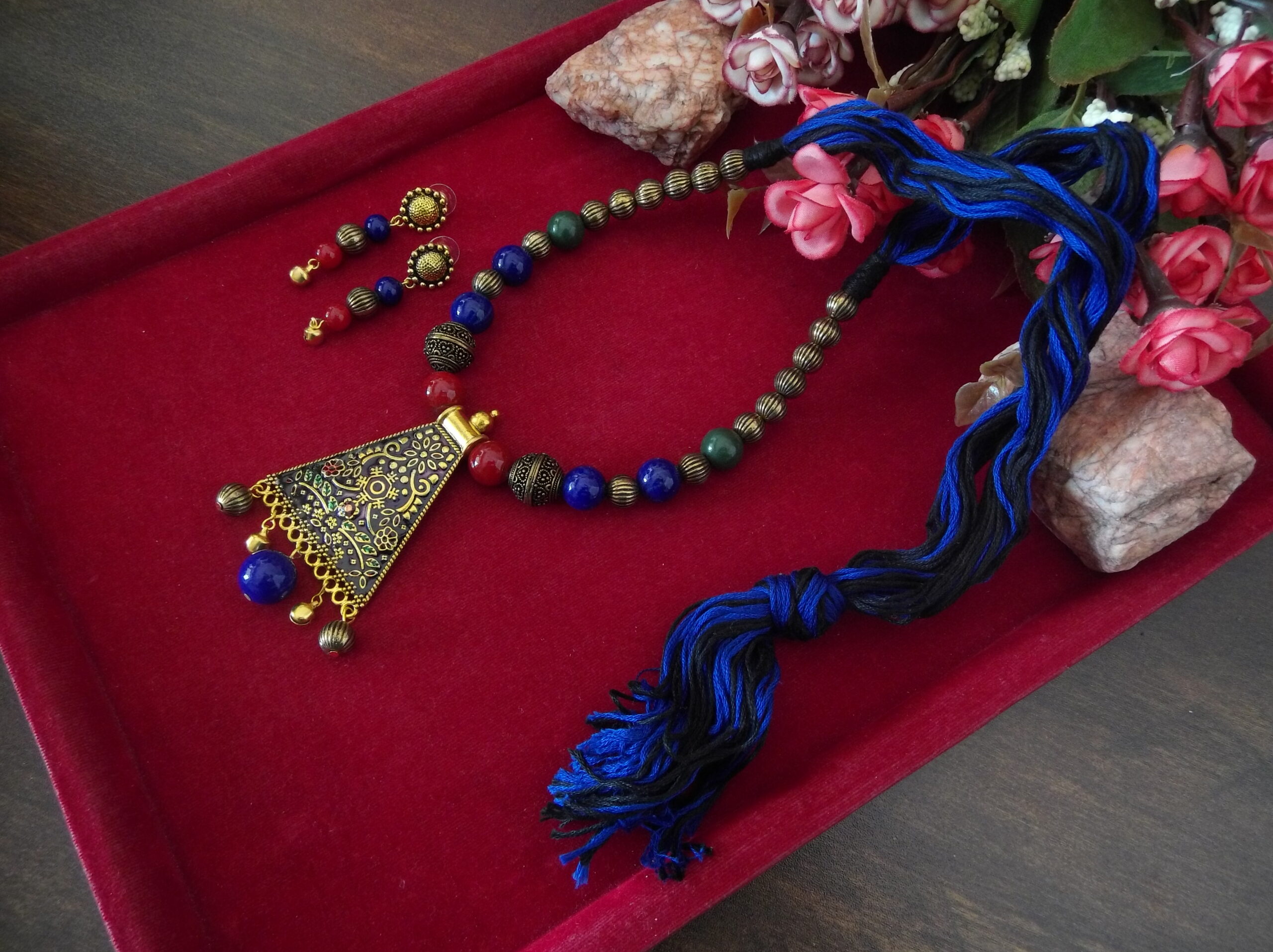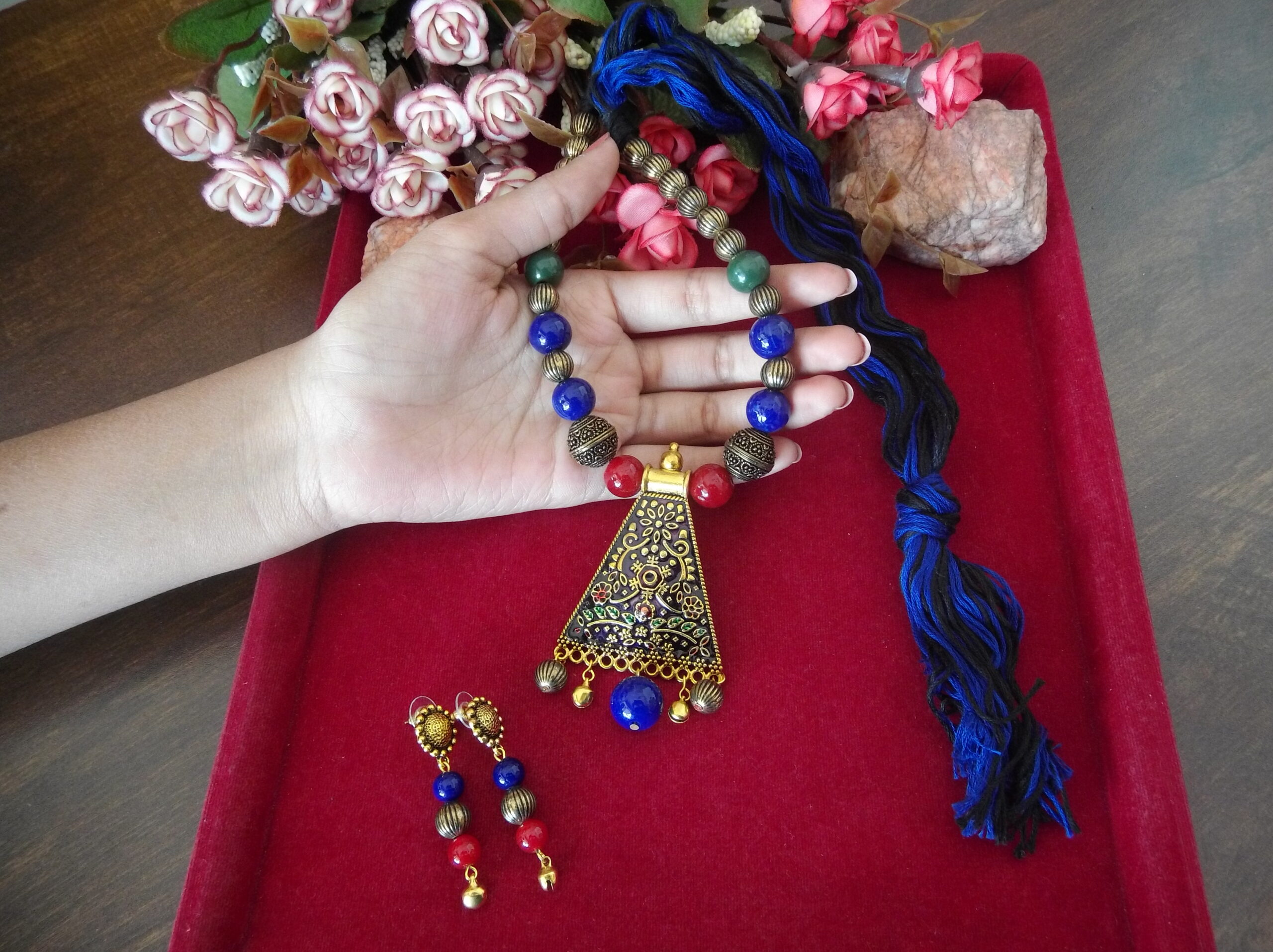 Whether worn together as a set or individually as statement pieces, our Handmade Red Blue Black Golden Beaded Necklace and Earring Set is sure to turn heads and spark conversation wherever you go. Elevate your look with this exquisite handcrafted set that embodies the essence of timeless beauty and artisanal craftsmanship.