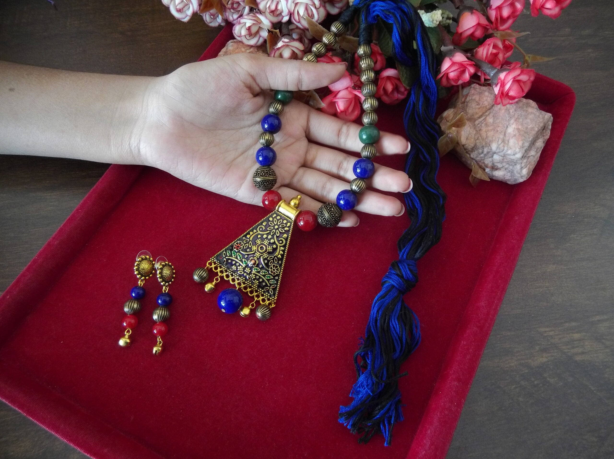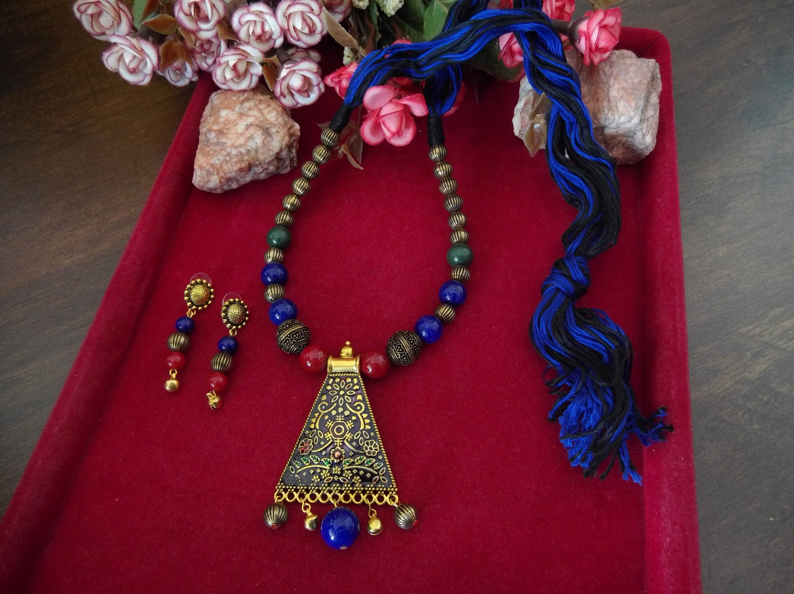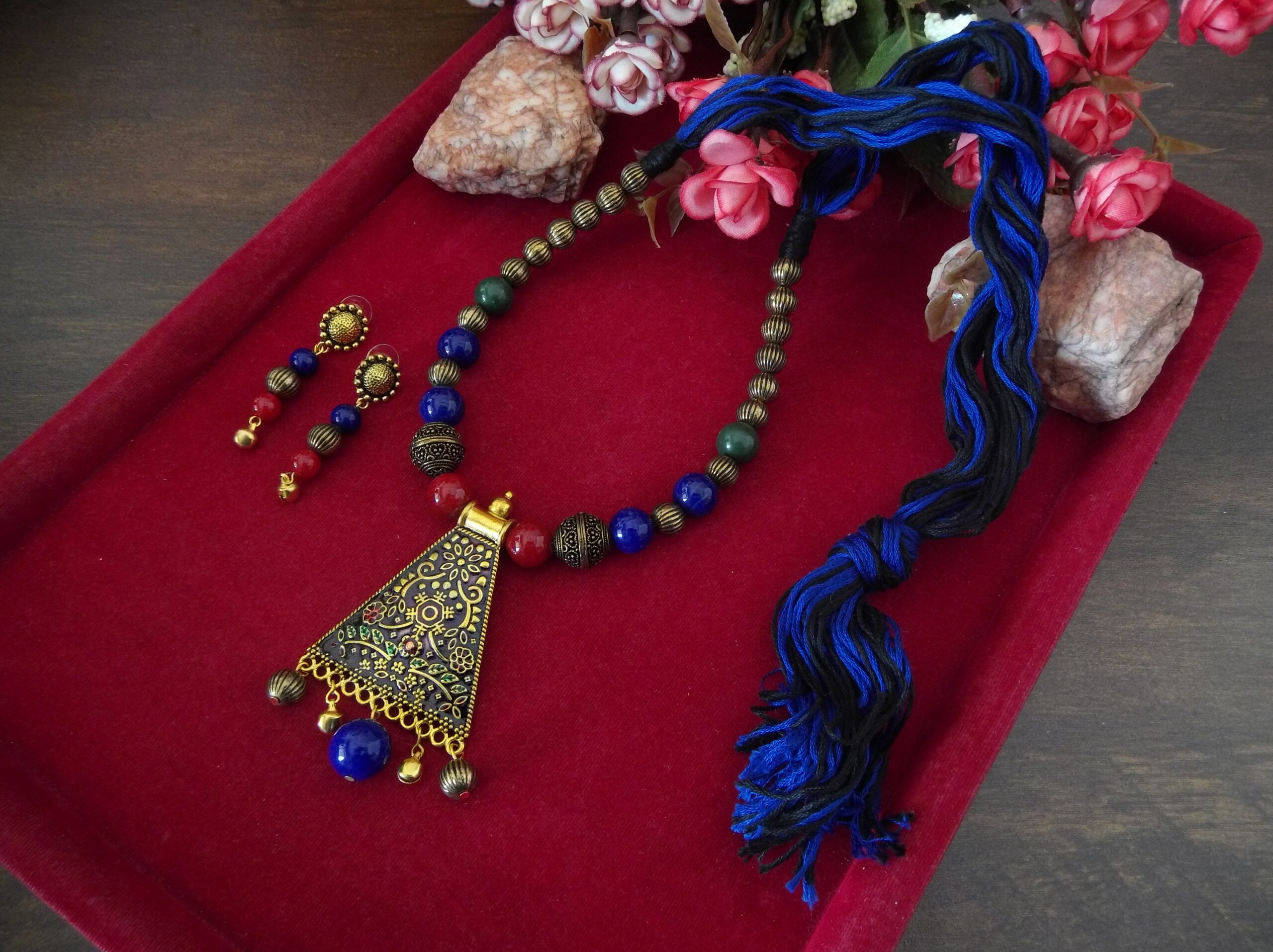 Whether worn together as a set or individually as statement pieces, our Handmade Red Blue Black Golden Beaded Necklace and Earring Set is sure to turn heads and spark conversation wherever you go. Elevate your look with this exquisite handcrafted set that embodies the essence of timeless beauty and artisanal craftsmanship.